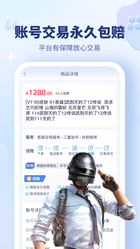 买号宝有着诸多特色服务:主打官方包赔服务,还提供同城交易;要求卖家露脸签协议,若出现账号被找回的情况,平台会上门追号等。这些服务旨在让您在购买游戏账号时能拥有更安全、更周到的体验,平台用心对待每一笔交易,是专为游戏爱好者量身打造的一款应用。