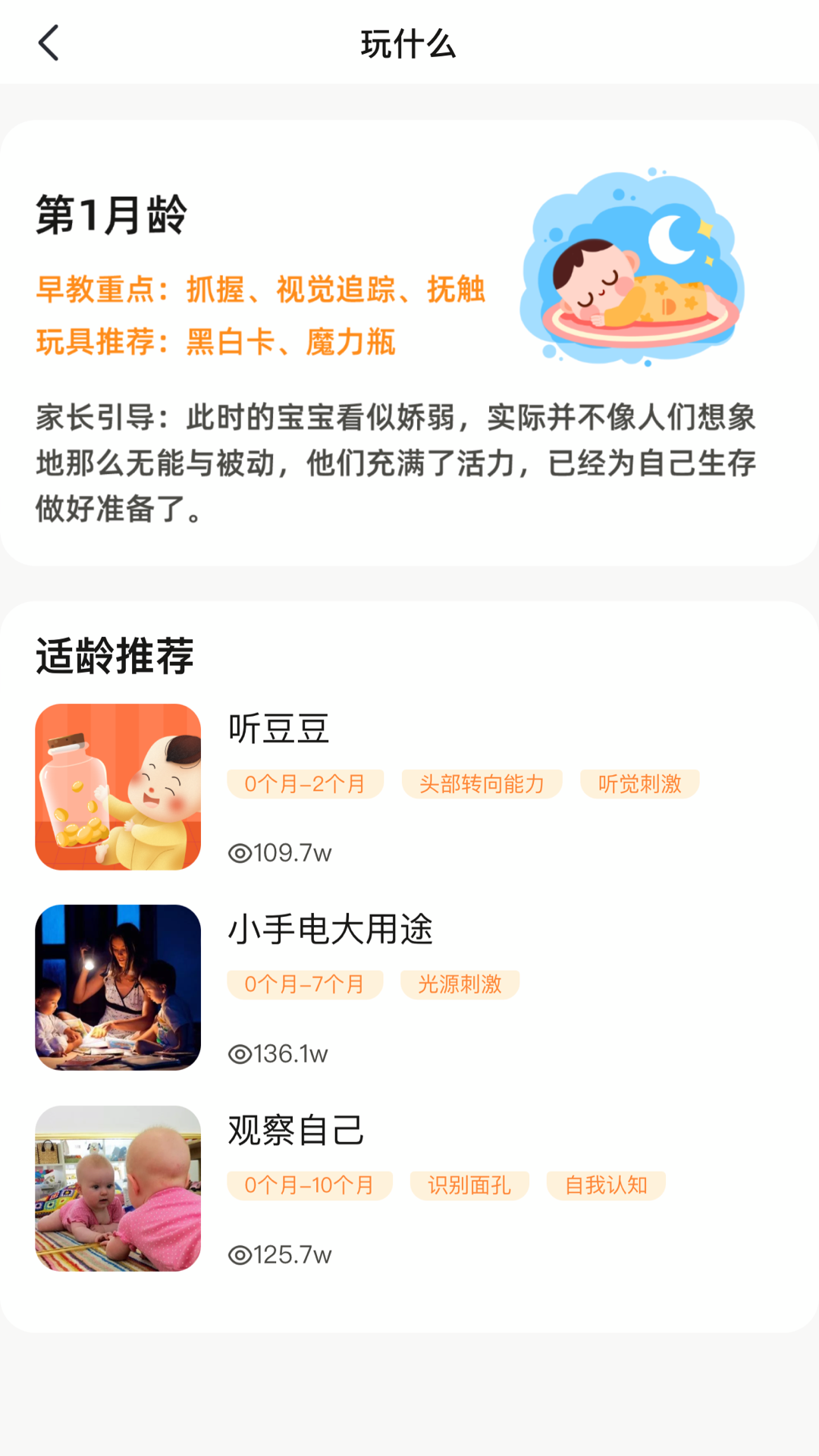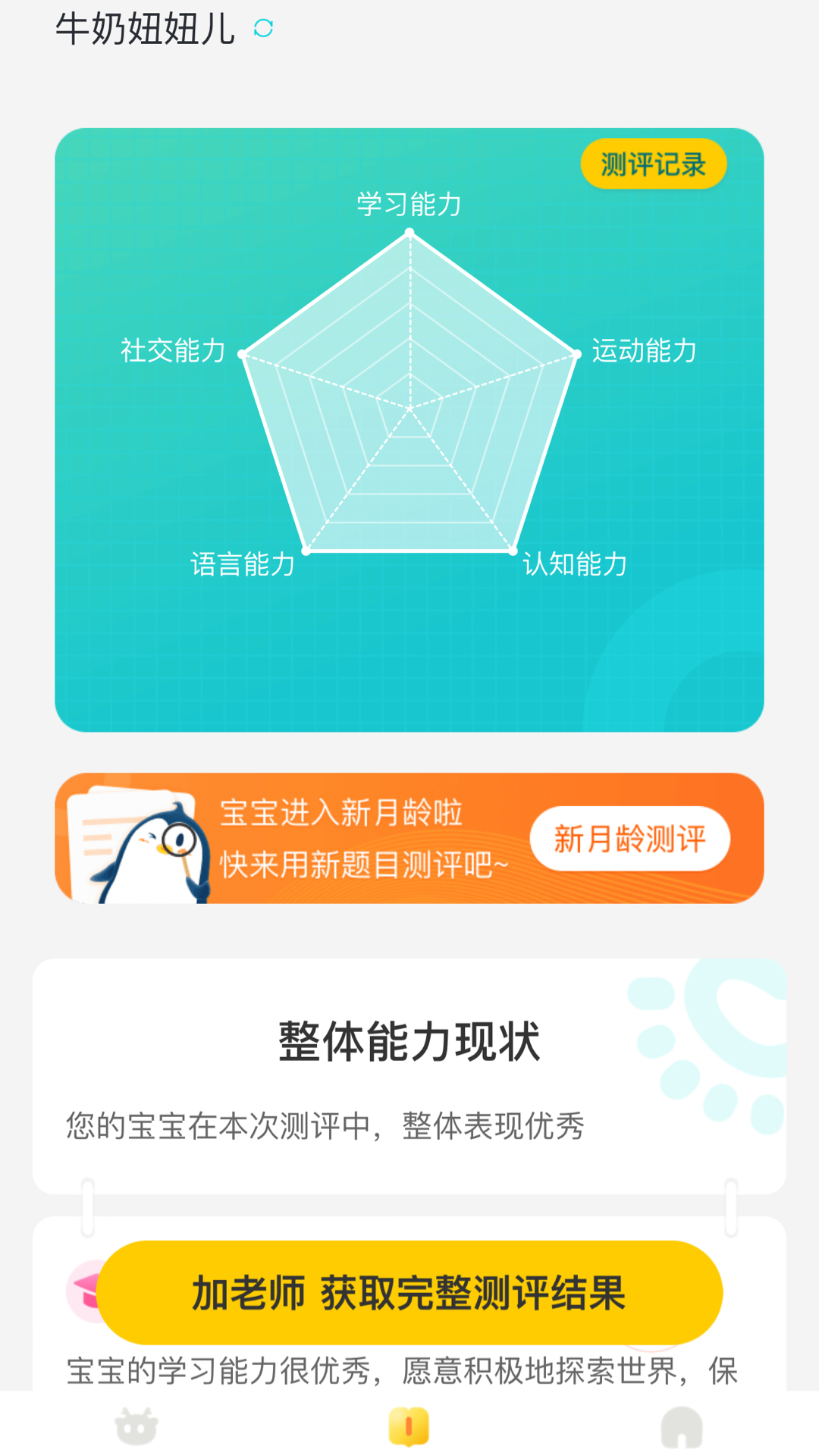 嗨宝宝,给0-3岁宝宝提供发育测评工具,精细化分龄,轻松掌握宝宝每个月龄的发育重点。【工具介绍】-玩什么功能区:4大模块,0-36月龄精细分龄,了解宝宝每个月发育要点ꔷ 早教重点 每月宝宝发育里程碑,包括发育指标,以及五大领域的测评要点ꔷ 玩什么 每个月龄宝宝早教重点,以及玩具推荐,根据宝宝月龄推荐适配的游戏ꔷ 听什么 根据宝宝的发育特点,为您挑选儿歌,对于孩子的韵律、音乐品味都是很好的帮助ꔷ 家长需要注意什么 给您提供更多关于宝宝常见具体问题的解决方案-测评功能区:联合关工委、中科院依照中国儿童发展的阶段性特征,全面覆盖孩子成长发育过程中五大能力、二+一个子维度等多项可测量指标制定出一套自有测评体系。