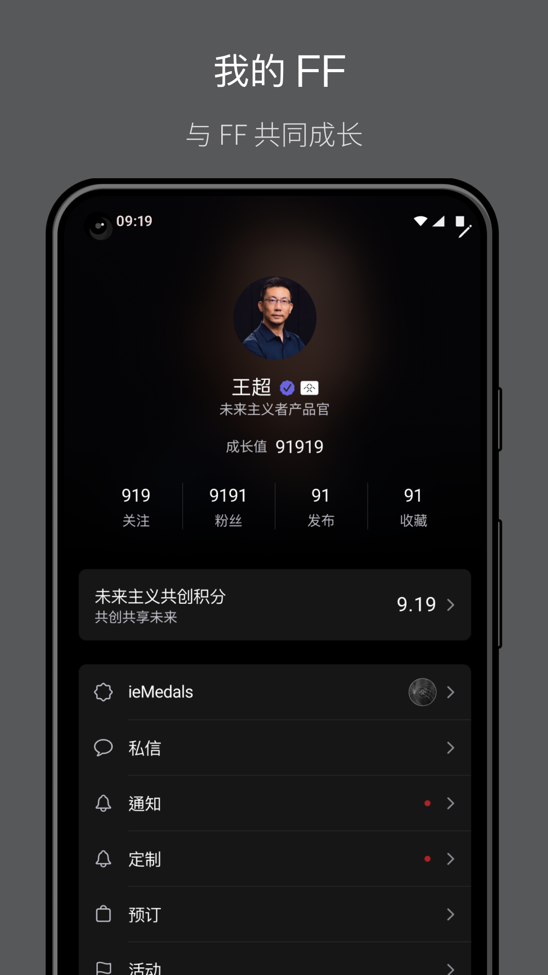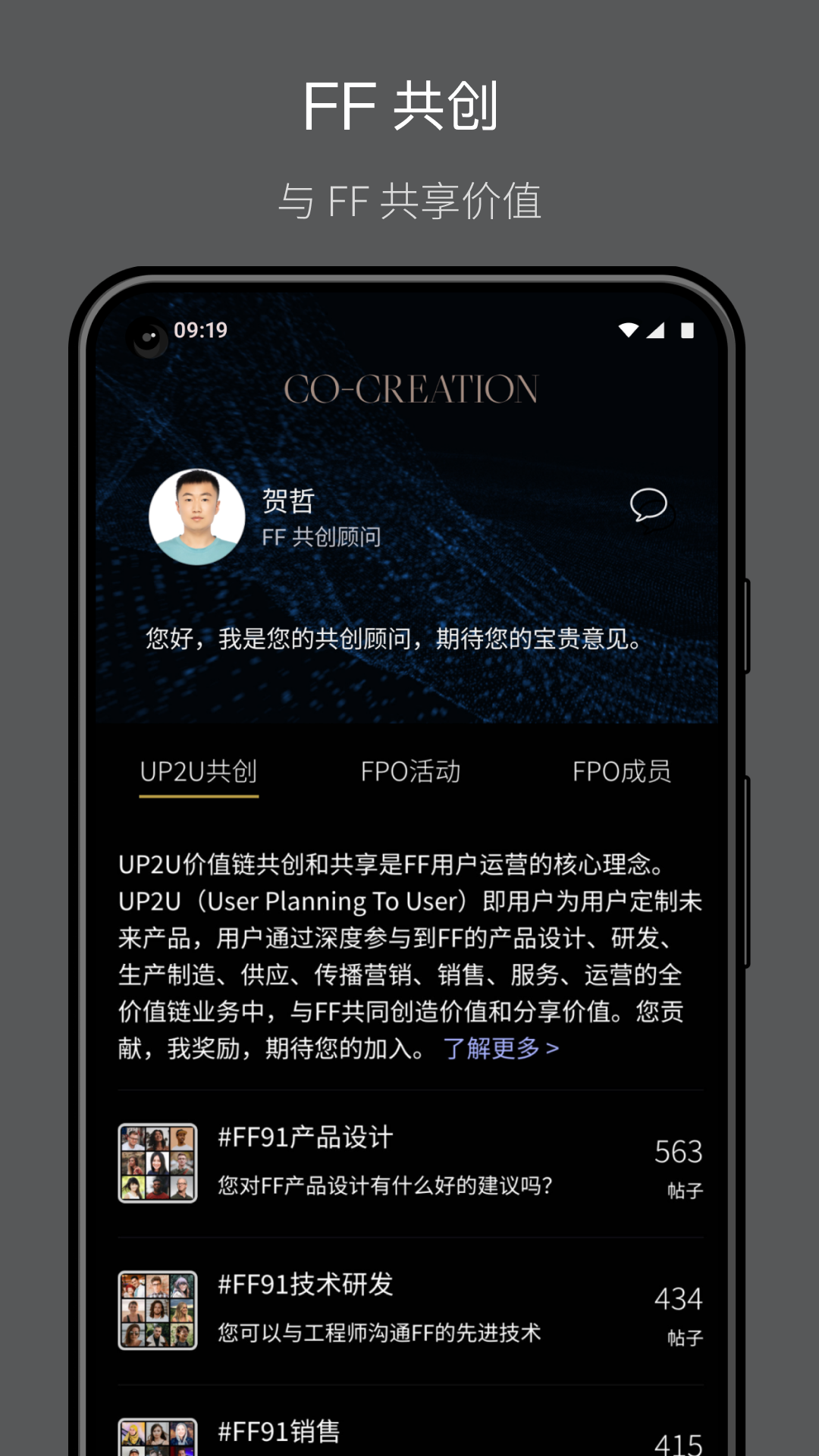 您可以深度参与到FF的产品设计、研发、生产制造、营销、服务、运营的全流程全生命周期中;并通过互动和反馈,与FF一起共同创造价值,您还将获得FF成长值和FF未来主义共创积分。