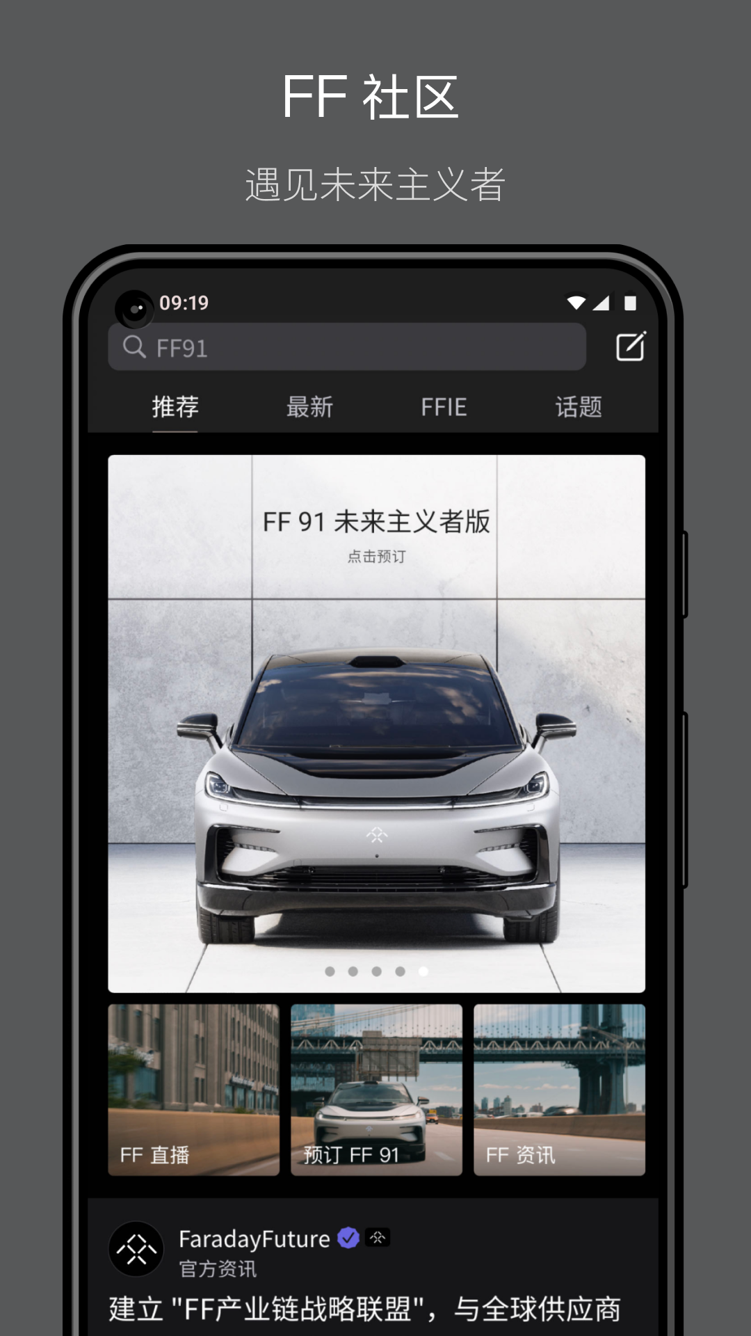 FF中国 App是FF以用户为中心打造的移动互联网电动出行生态系统解决方案。在这里,不仅可以了解和预订属于您的FF 91,获取FF官方资讯,了解FF历程、前瞻产品技术科技和精彩活动瞬间,还可以在FF社区与志同道合的未来主义者朋友们交流;更可以参与到FF产品全生命周期全流程中,通过互动反馈,与FF一同成长,共创价值和分享价值。