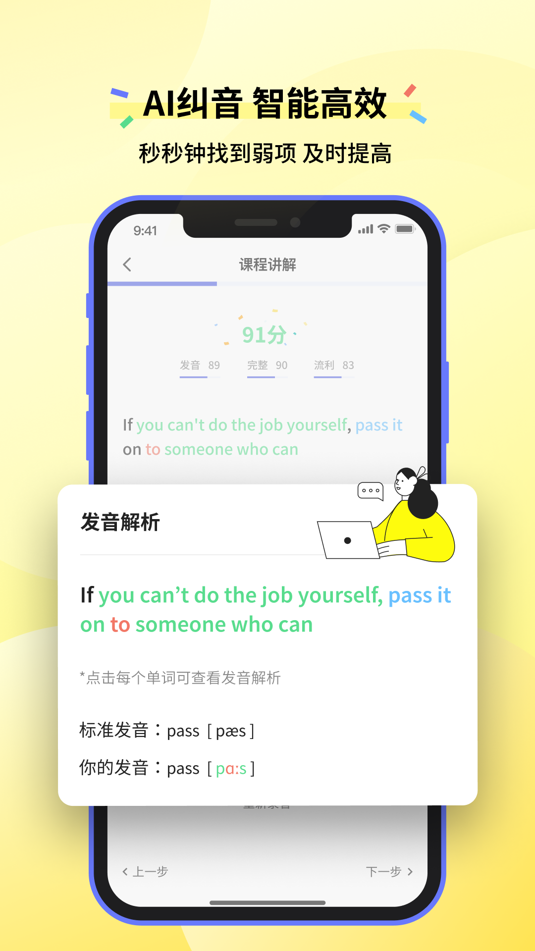 发音纠错:识别您的口语并从发音准确、流利度和完整性三个维度纠正您的口语