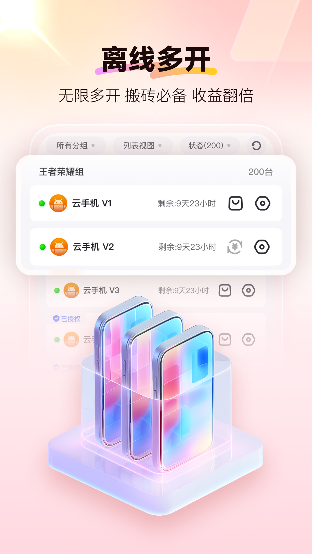 一键云端手游托管,游戏24小时云端在线运行不N机,关机、断网也持续升级,没网没电,都没有关系!彻底释放你的手机,解放双手!