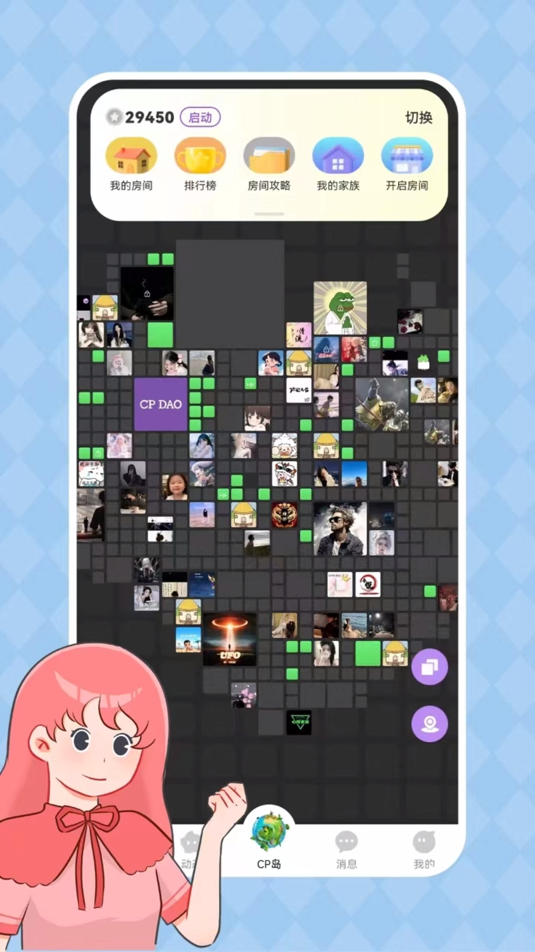 在CP岛这个独特的世界里,你能够与小伙伴们一同创建家族。在这里,语音畅聊毫无阻碍,还能举办拍拍、相亲等各种活动,迅速搭建起关系链,从而收获情侣、闺蜜、兄弟、师徒等多种多样的关系。