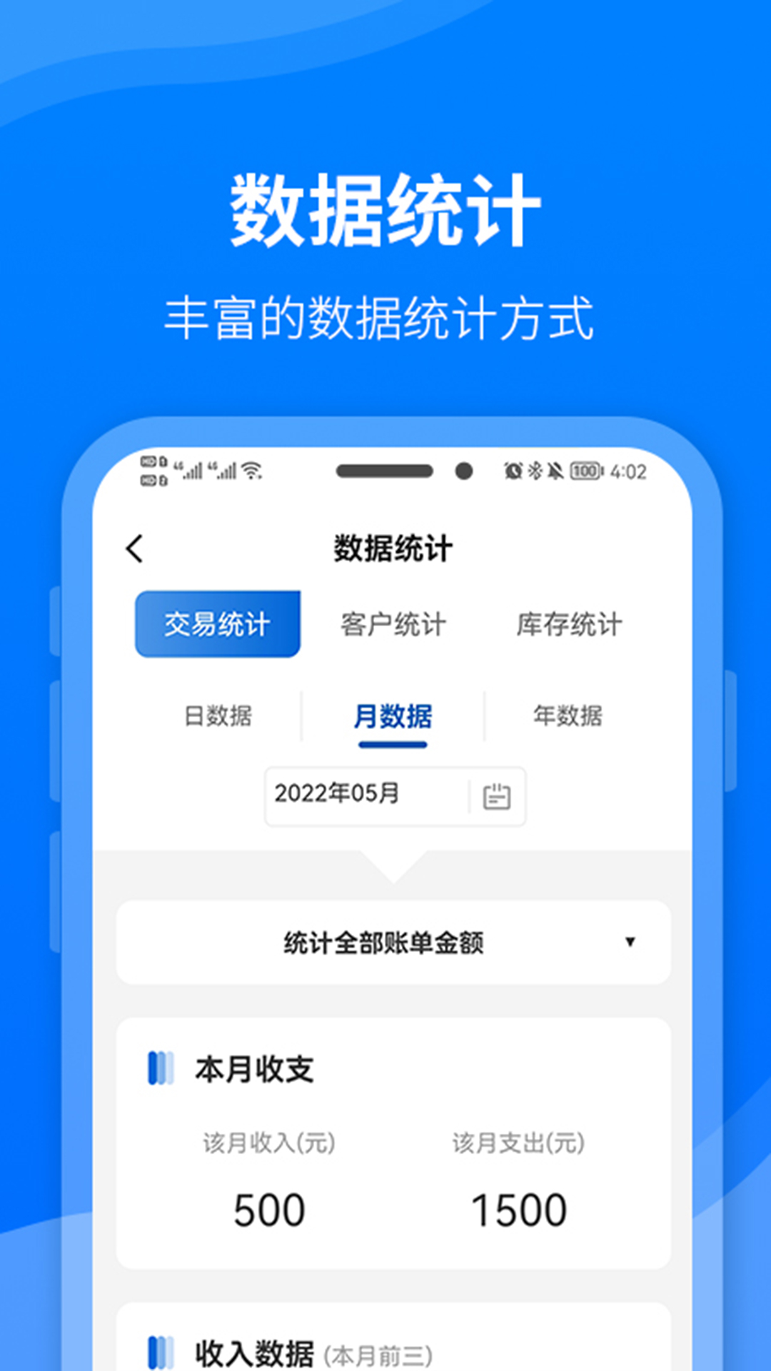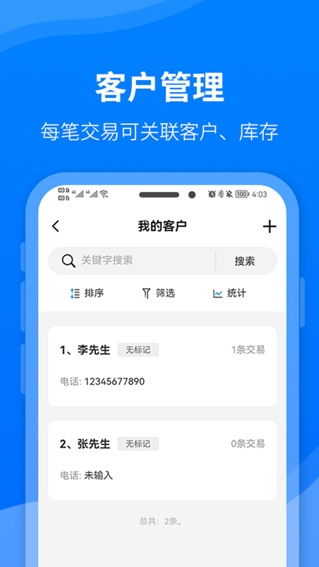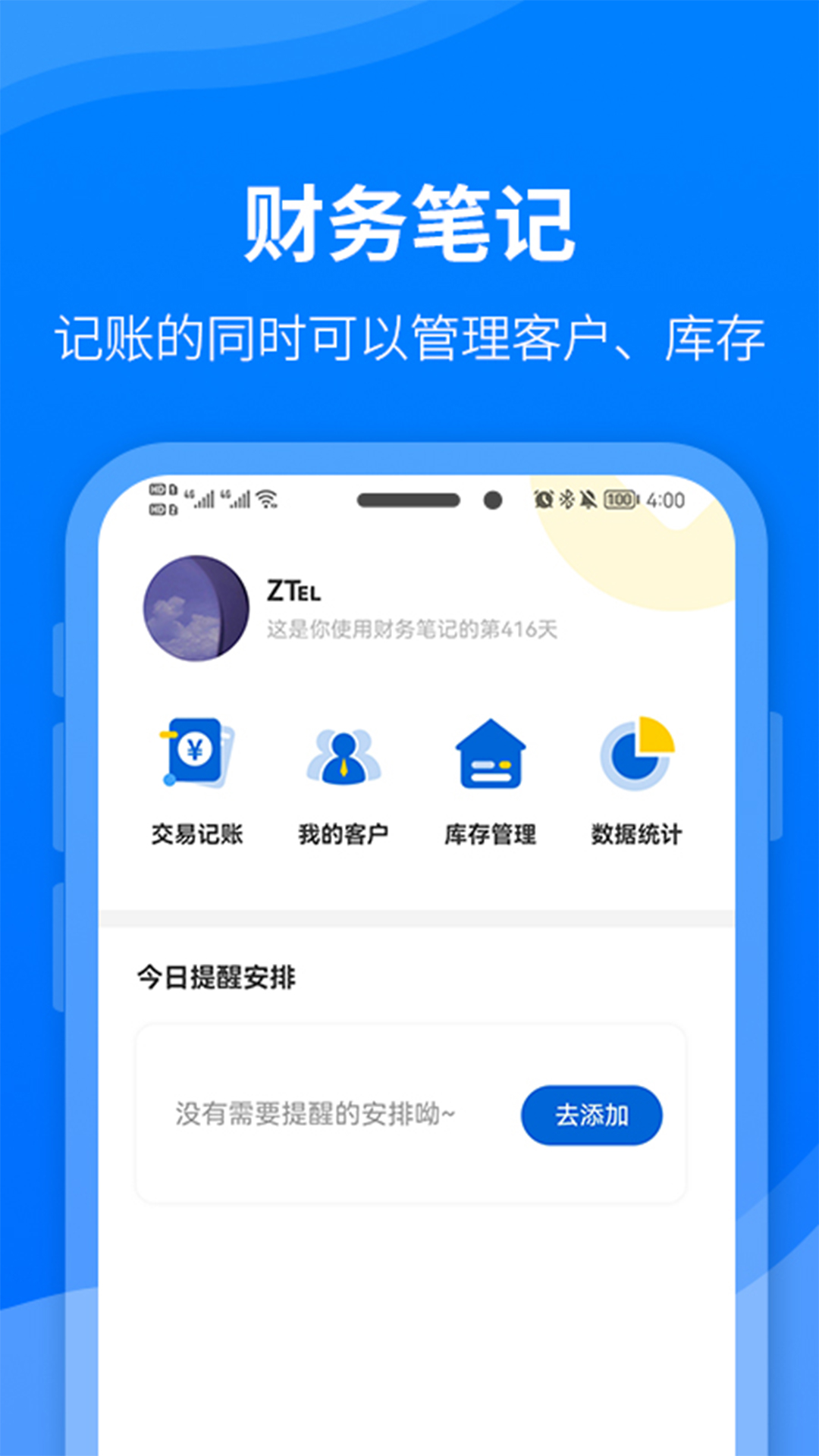 简洁的财务记账软件,同时拥有管理客户和库存等功能,每条交易记录都可关联客户库存,清晰明了,拥有灵活的数据统计功能,方便直观。