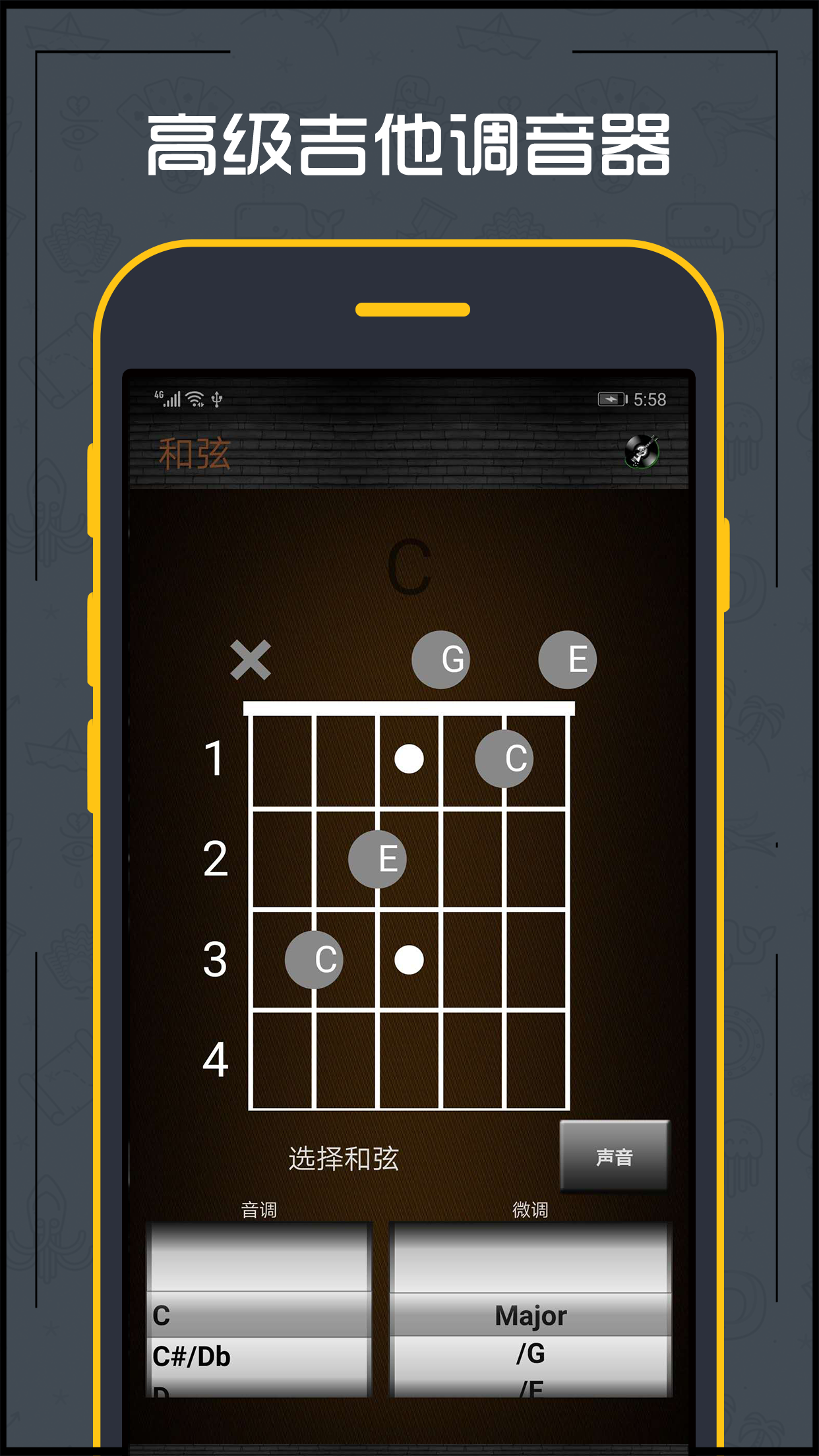- 和弦学习游戏:可用来学习、练习并掌握吉他和弦,学会用耳朵辨别各种弦。