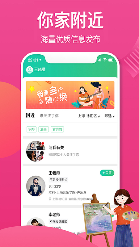 3KM借助地理定位以及AI智能匹配技术,迅速为您筛选出满足需求且距离您最近的老师或者学生。
