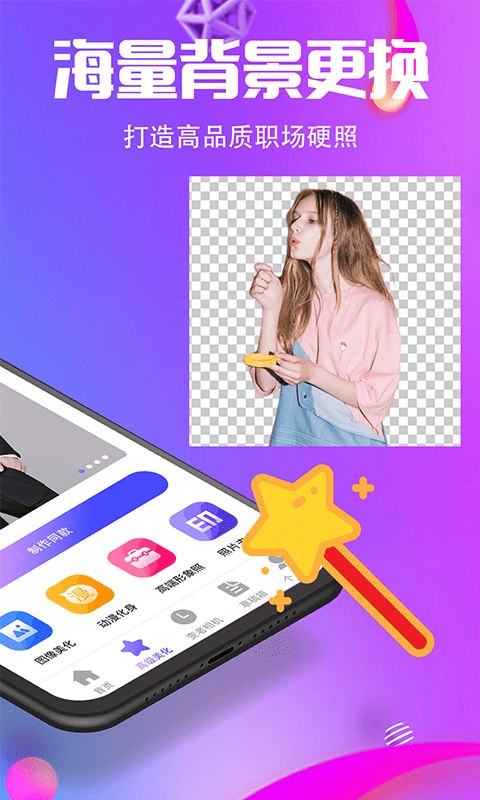 2. 高端形象照:只需上传照片,软件就能智能抠图,可随意切换背景图片,还能一键改变颜色生成证件照、职业照、半身照。