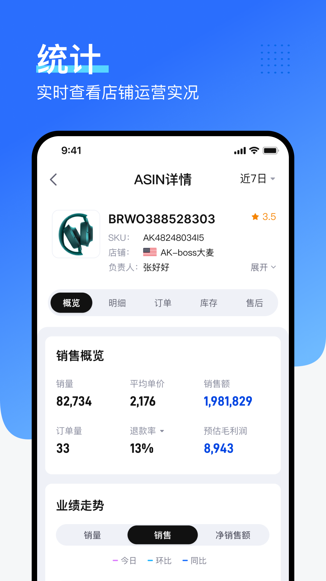 2. 统计:从多个维度查看商品销售、库存以及售后的详细情况。