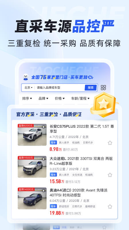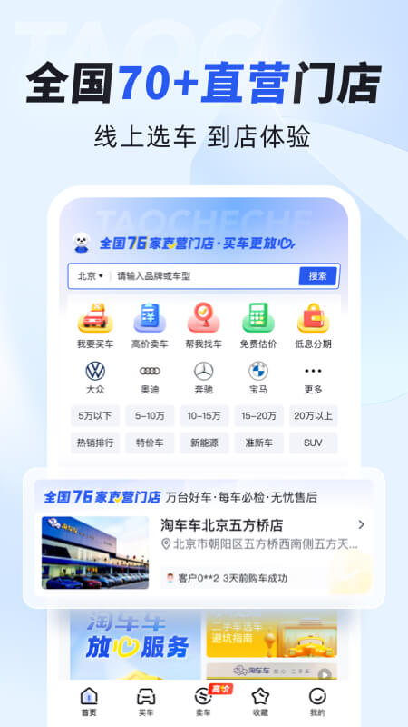 - 「门店直营·放心挑选」:淘车车在全国拥有200多个直营门店,这些门店遍布各个城市。其车辆统一采购,并且遵循统一的标准,确保每辆车都有着统一的品质,让您在选购时有更多放心的选择。