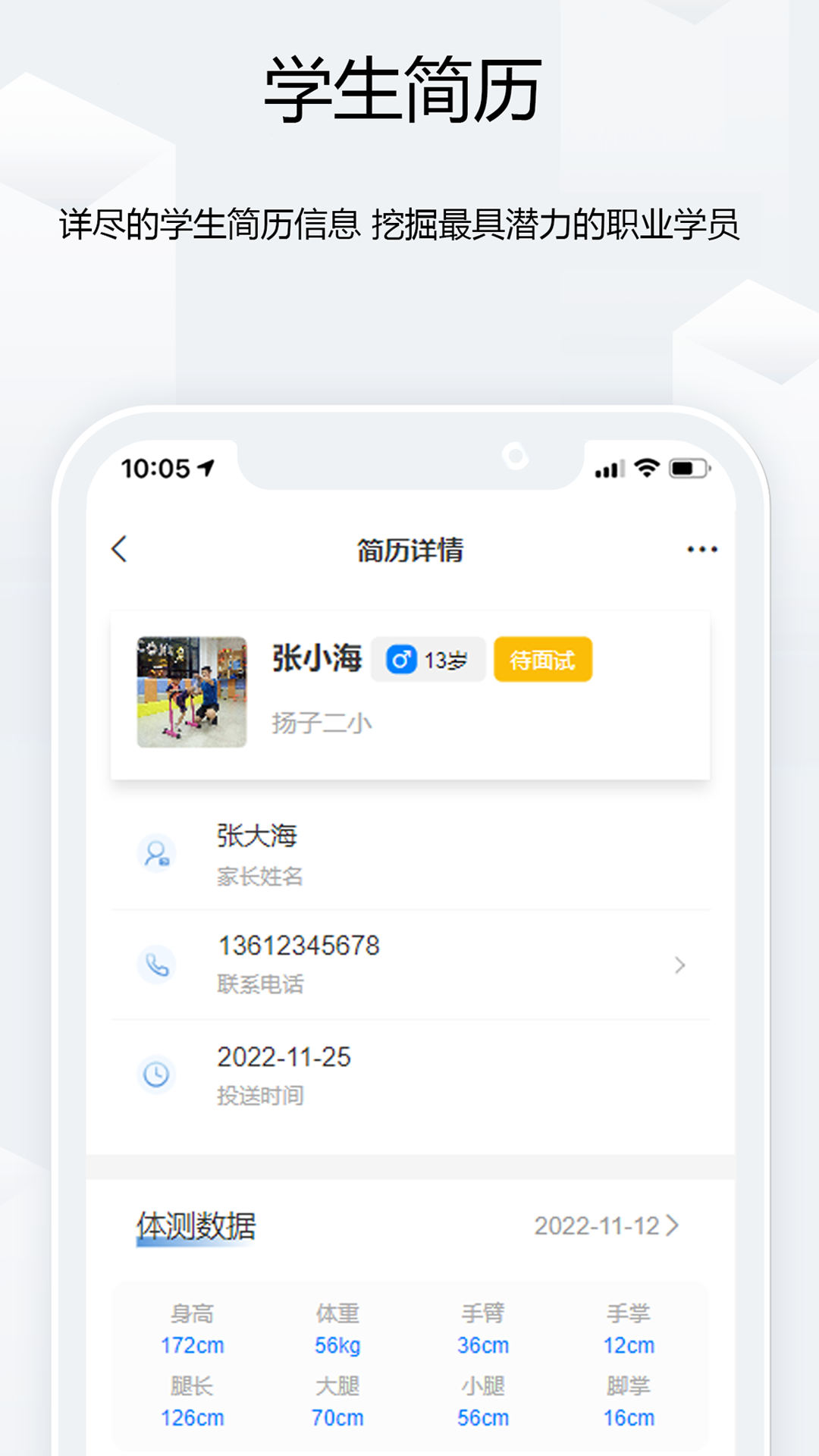 康胜App是一款为职业体育运动教练及体校教师提供的职业体育选材App,职业教练可以通过康胜App查询海量的青少年体测数据,寻找适合自身体育运动项目的优秀人才,并通过查询简历及面试通知的方式,为职业运动教练及有意向走向职业运动的青少年之间构建畅通无阻的桥梁。