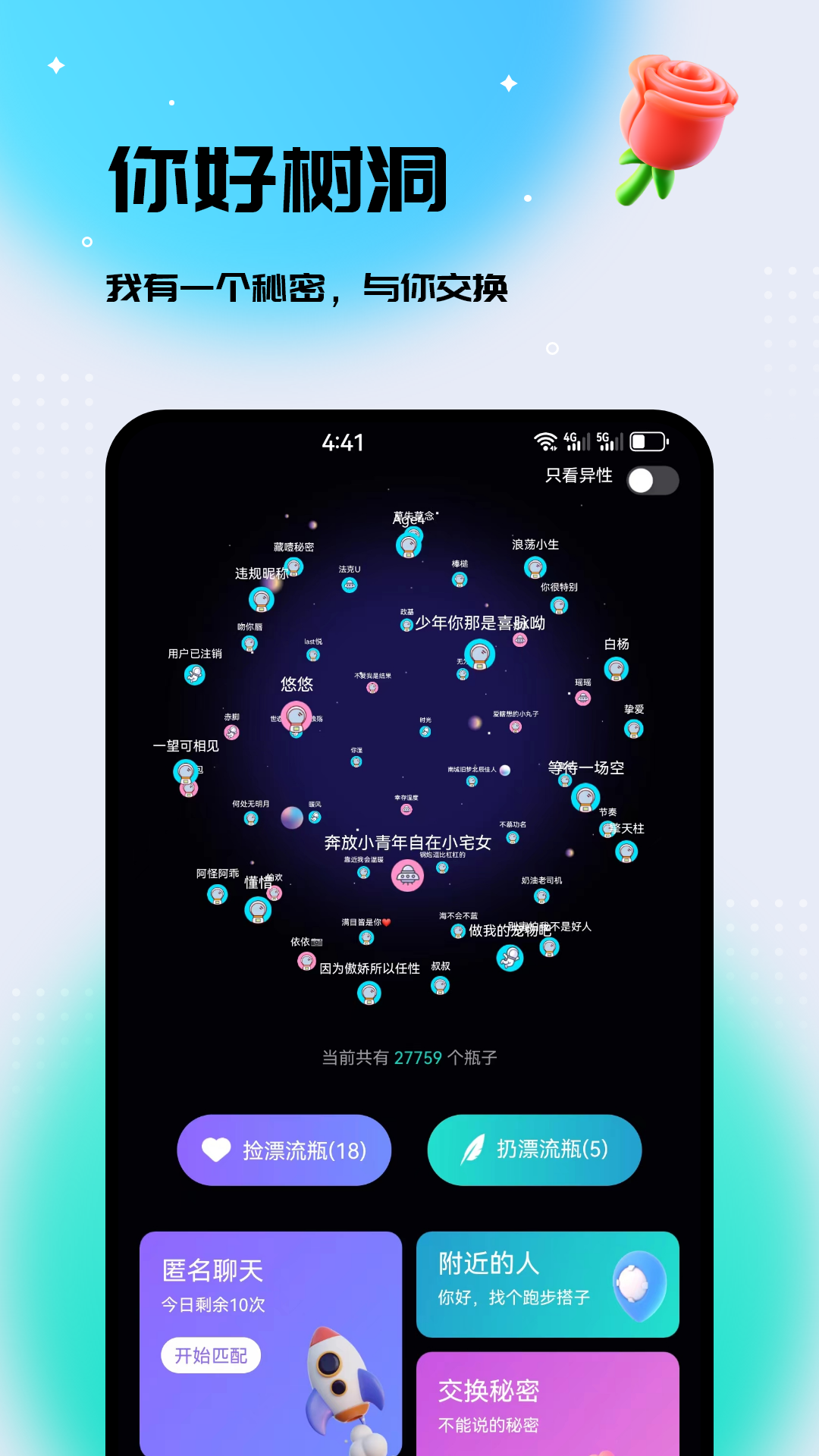 你好树洞秉持着这样的理念:让每个人都能倾诉,让每种倾诉都有回应,让每个人都能自在呼吸。在这里匿名交流,能释放你所有的压力。在你好树洞,你无需承受现实社交带来的压力,大家因兴趣而聚在一起,自由地敞开心扉,真实地表达自己,展示个人兴趣,分享生活点滴,从而结识更多有趣的灵魂,找到你的红颜知己或者蓝颜知己。