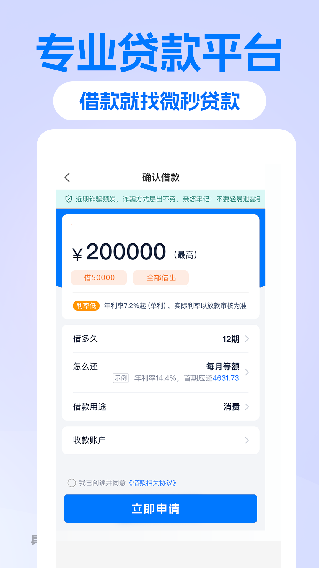 微秒贷款是一款正规专业快速信用借钱的贷款平台,应用操作简单,用户只需手机在线申请,快速审核,助您闪电分期借钱贷款,是您应急周转的备用金钱包!