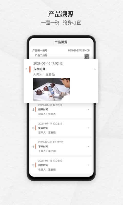 始终遵循先评鉴后发货的原则,真实记录作品信息,借助区块链技术达成一壶一码,使得产品信息终身可查。