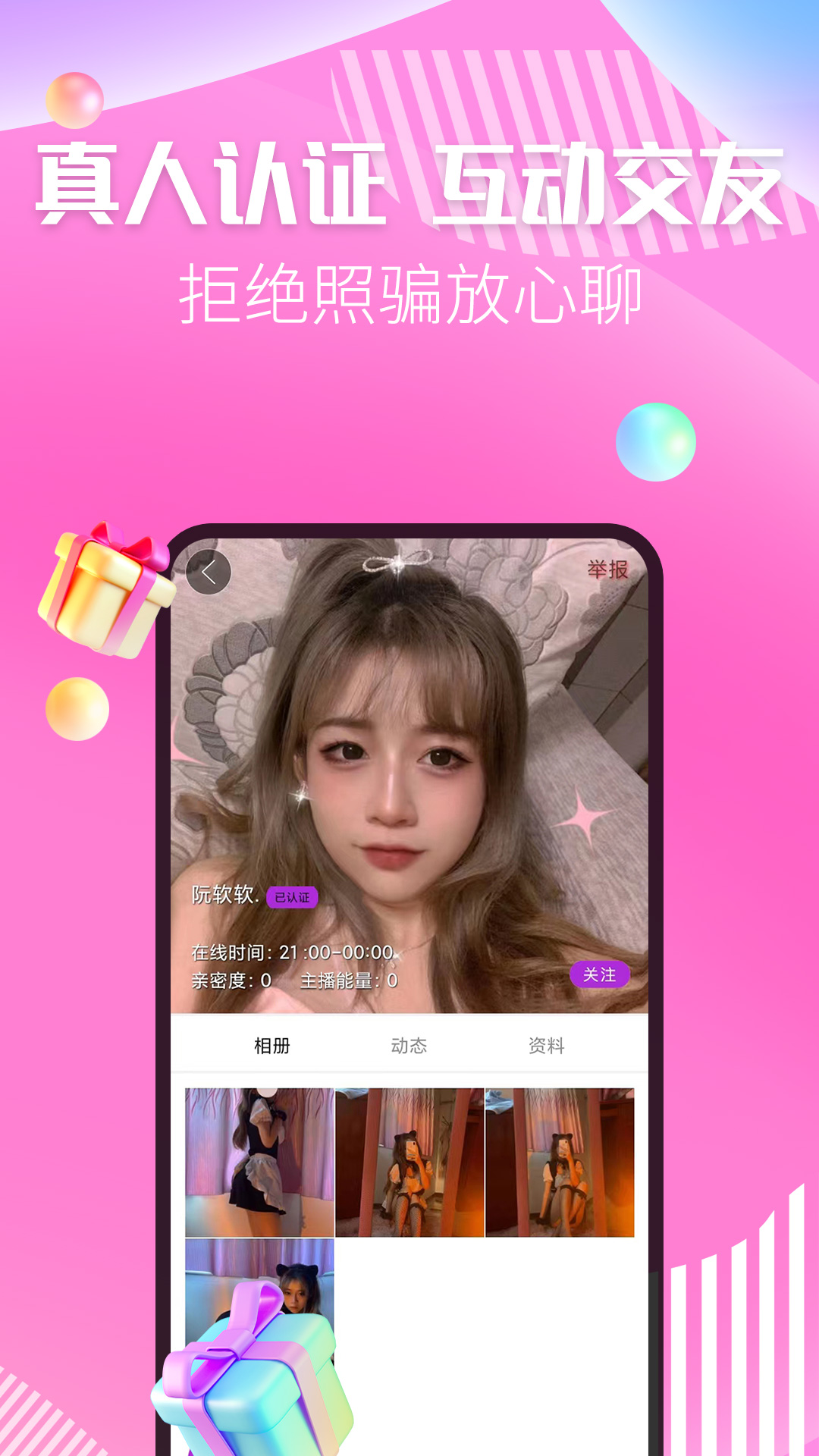 麦撩视频交友,这是一款专注于在线视频聊天约会交友的移动社交类应用。它聚焦于陌生人社交聊天领域,能够实现陌生男女的快速匹配,让你轻松与陌生人闲谈一番,从而暂时从熟人社交圈里走出来。在这里,可没有那种缺乏情感温度的文字聊天哦,麦撩视频交友开启的是零距离的真人面对面交友模式呢。