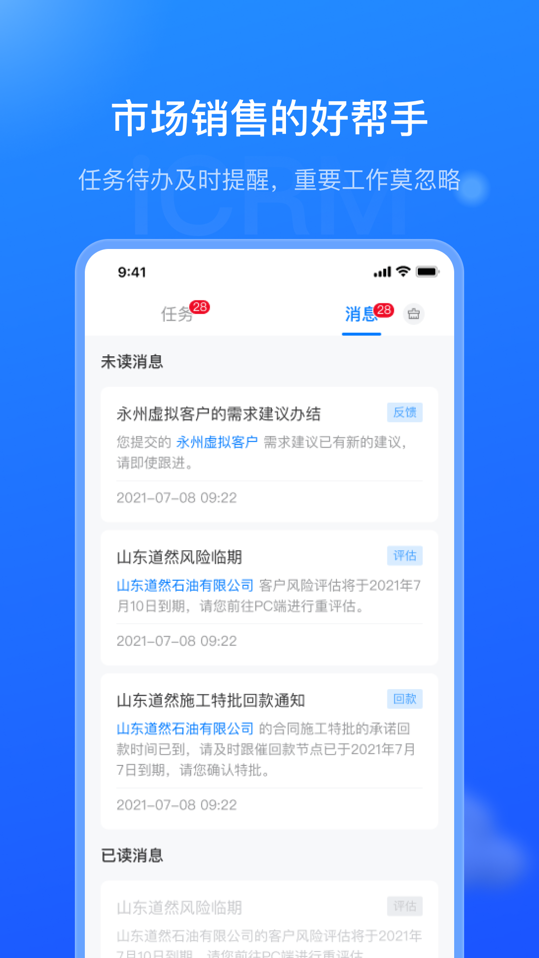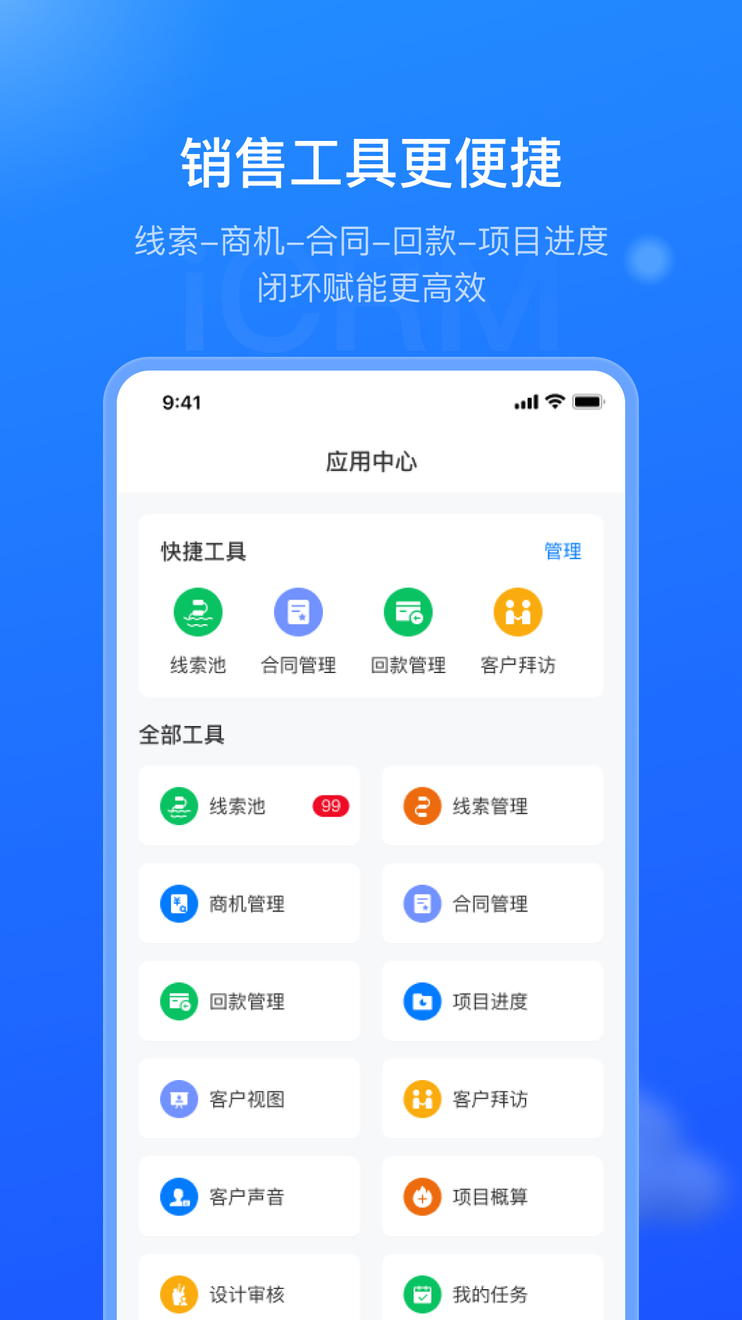 销售赋能平台(iCRM)是面向市场经理、主任,管理人员等各级市场相关角色的客户关系管理数智化产品,覆盖了线索、商机、合同、回款、项目等市场人员参与的各阶段,并具备各阶段数据规范化采集、业务合规化推进的数智化闭环能力,增进客户认知,为销售人员赋能!