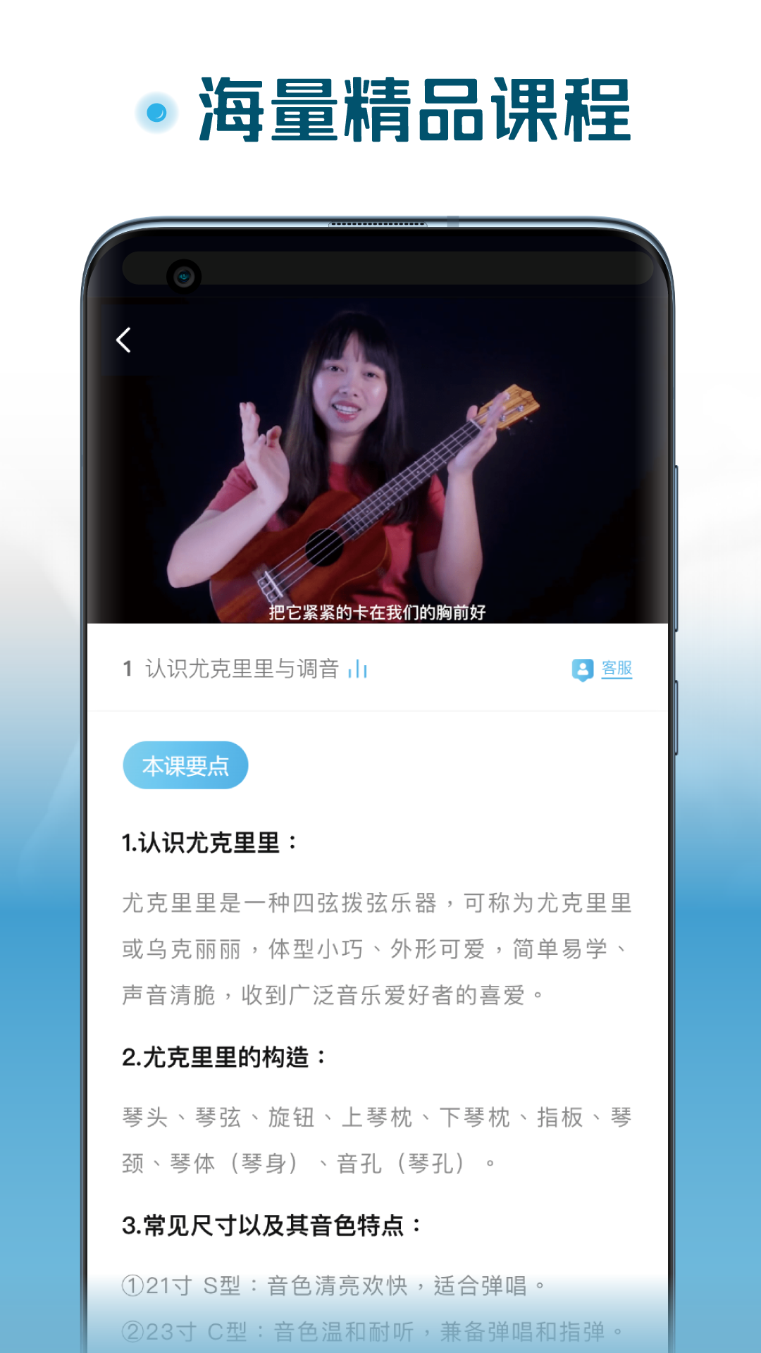 火听尤克里里还为广大自学尤克里里的用户提供免费的教学课程呢。这些课程从认识尤克里里、尤克里里调音、认识简谱等曲谱乐理知识,到节奏把握、和弦转换、指法技巧等方面,都进行了系统的教学讲解,能够助力零基础的吉他自学用户快速入门。