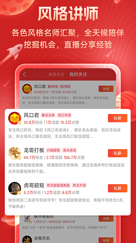 这里有众多风格各异的名师汇聚,他们全天候陪伴投资者,实时分享投资机会,还在直播中手把手传授操盘经验。