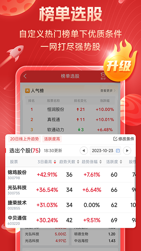 集合竞价板块对集合竞价进行全面解析,包含涨停试盘、主力资金大幅流入、量比大增等内容,能让用户及时掌握集合竞价中的异动股票;榜单选股有人气榜、强势榜、趋势榜、新高榜等,只提供对短线炒股有用的榜单,方便快速选好股。