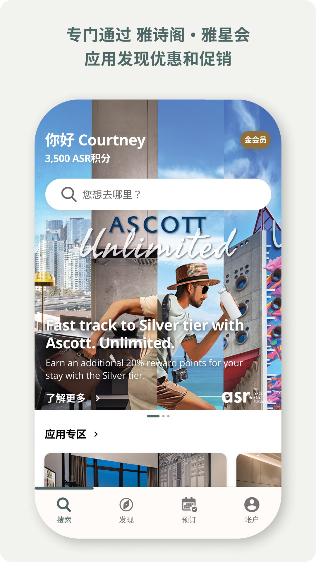 如果您还不是会员,可通过探索雅星会(Discover ASR)应用程序注册。注册后,您就能轻松预订住宿,赚取并兑换使用您的ASR积分了。