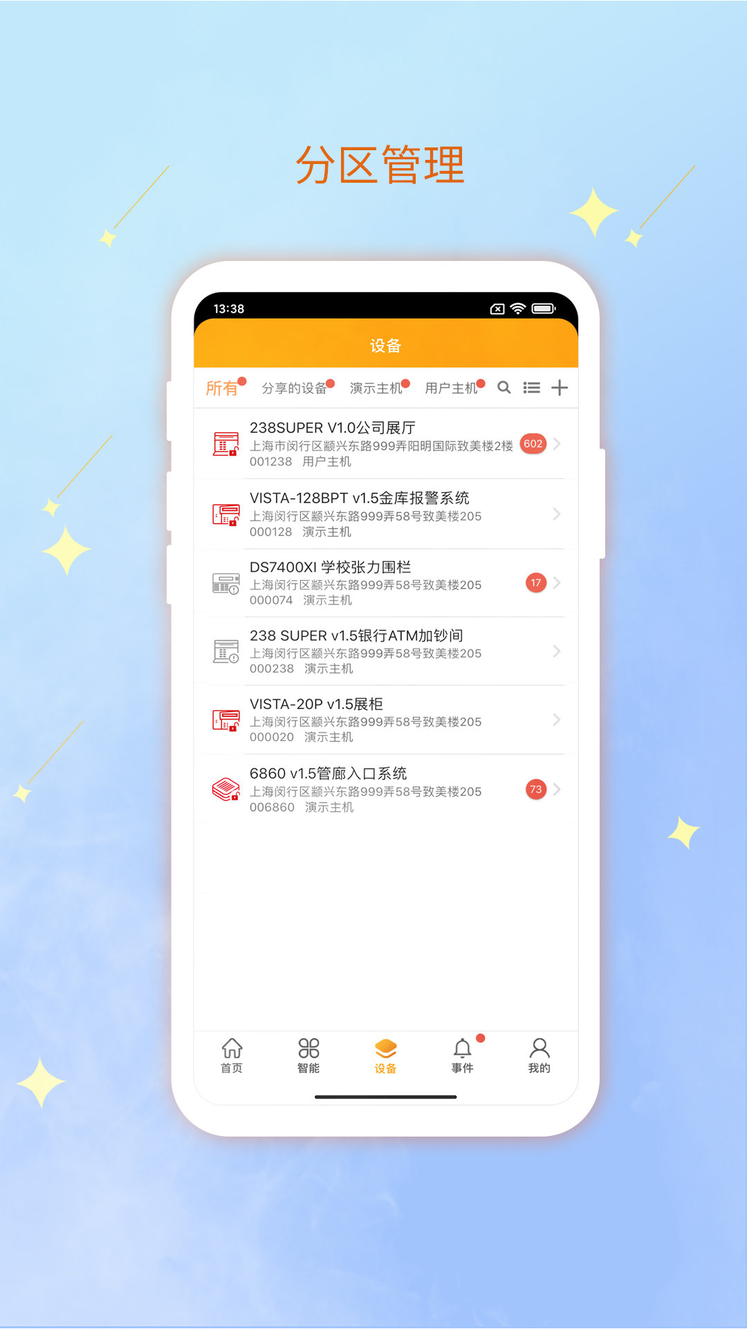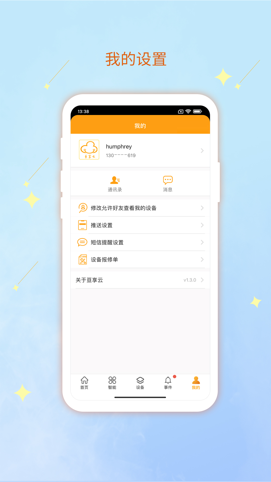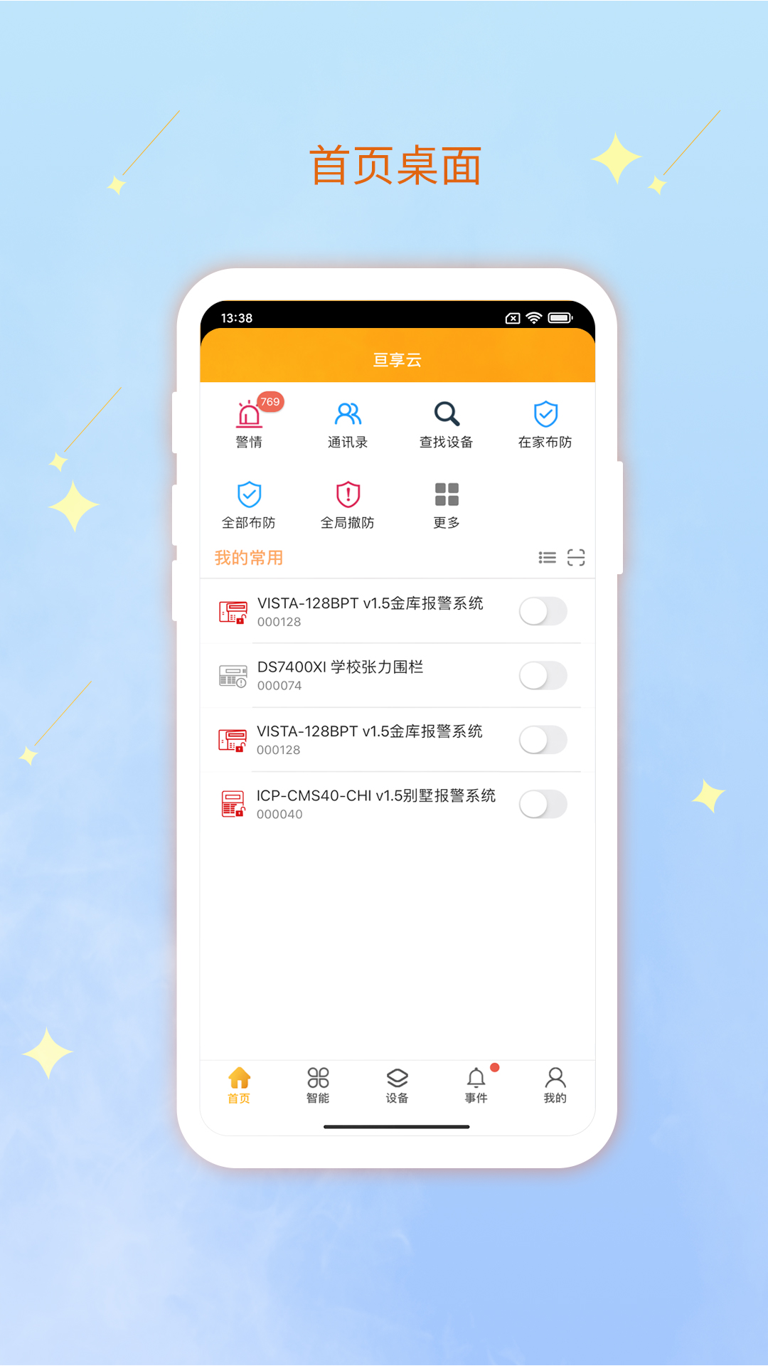 亘享云的APP端具备多种功能,例如可进行报警用户的管理、设备管理分组、分区控制、防区旁路、微信推送设置、短信接收人设置、分享设备管理、智能场景操作、定时布撤防、统计数据以及设备状态同步等操作。
