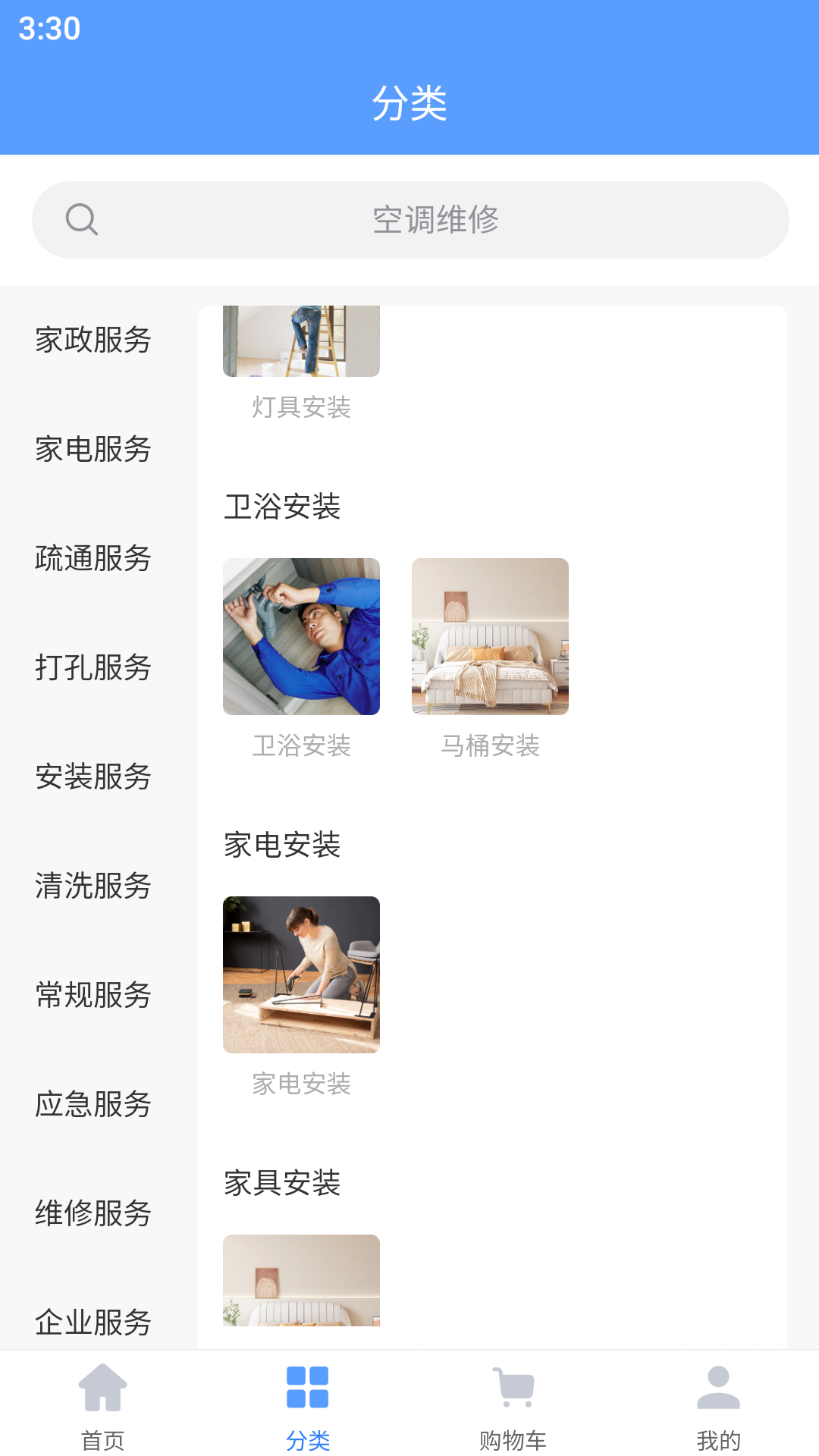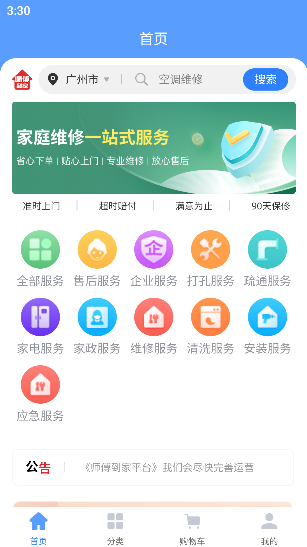 师傅到家平台提供多种同城上门服务。其中包括水电、家电的安装与维修,像厨电、卫浴灯具、家具、智能锁以及晾衣架等各类产品的安装也不在话下。平台还能进行家电清洗、空调维修与加氟的服务。另外,管道疏通、防水堵漏打孔等工作也可由平台师傅完成,家政保洁服务同样是平台服务项目的一部分。