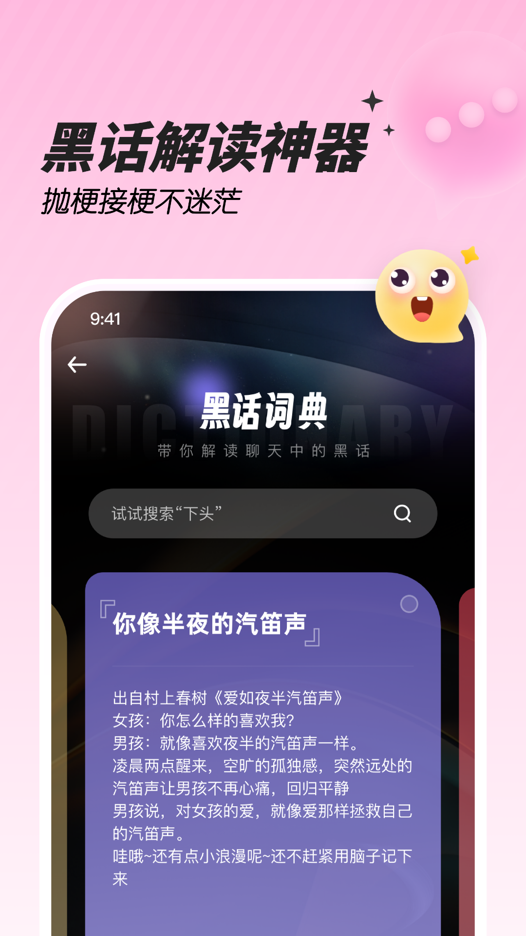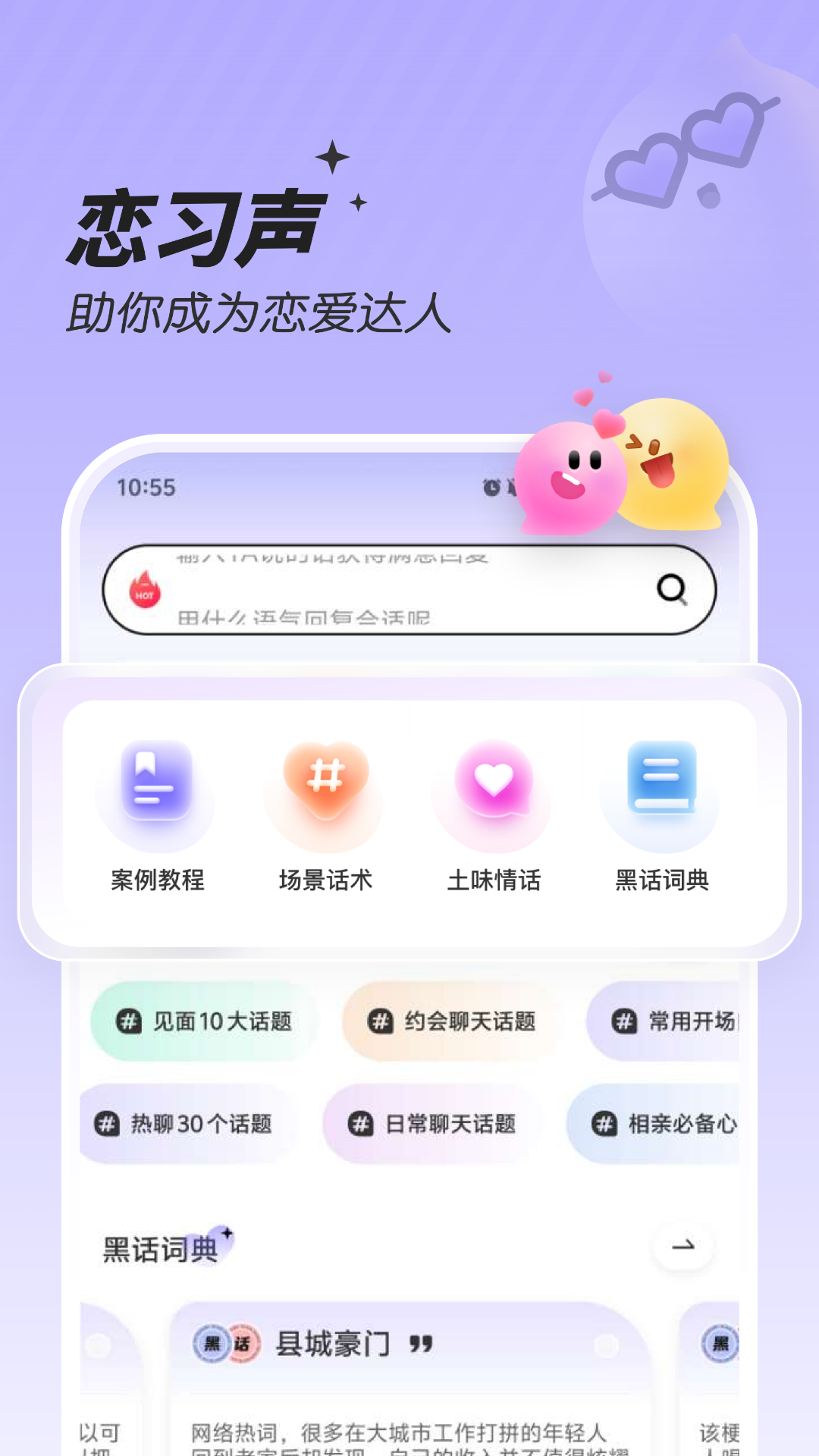 恋习声是一款恋爱聊天助手软件,是您爱情旅程中的智慧导航,集情感资讯教程与聊天艺术于一体的APP。它不仅仅是一款应用,更是您与心仪对象聊天时得力的助手,让每一次对话都充满趣味与魅力。