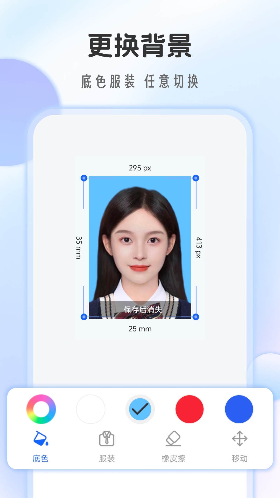 - 背景替换:一键更换背景颜色,蓝底、白底、红底任您选择,满足不同场景需求。