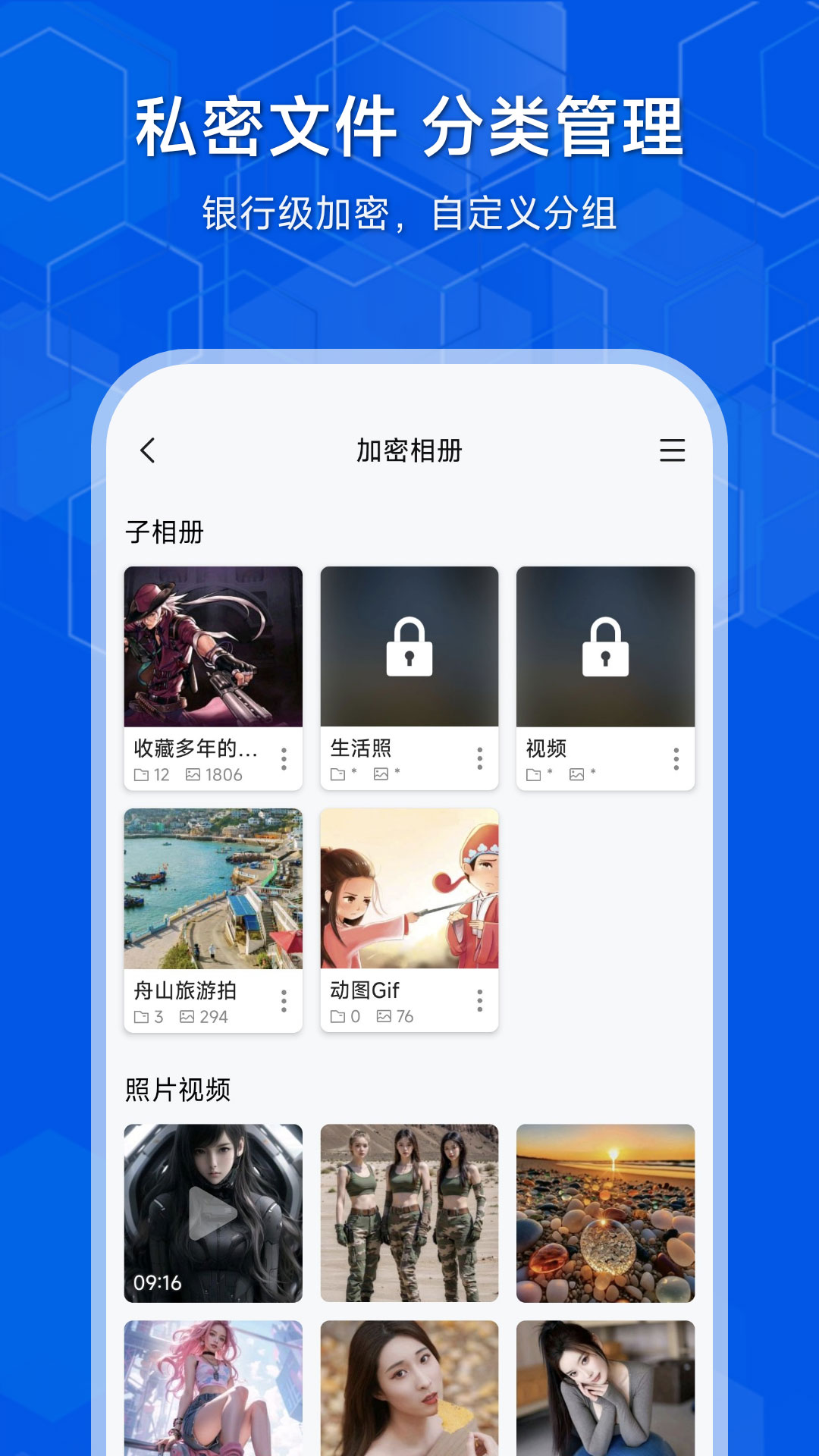 【私密相册】运用银行级加密技术,让您能够放心地对私人照片、私人视频和重要文件进行加密保存。