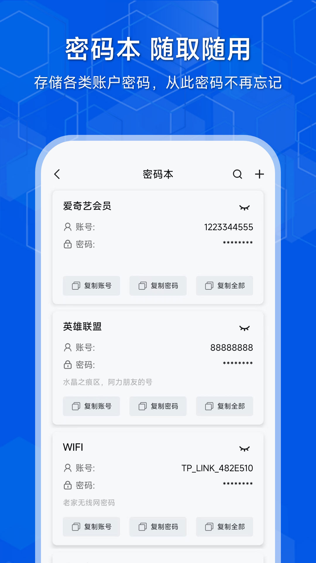 【密码本】还在为忘记密码而烦恼吗?隐存的密码管理功能为您解决这个问题。它能把您的各类密码安全地集中存放于一处,方便您随时随地查看。