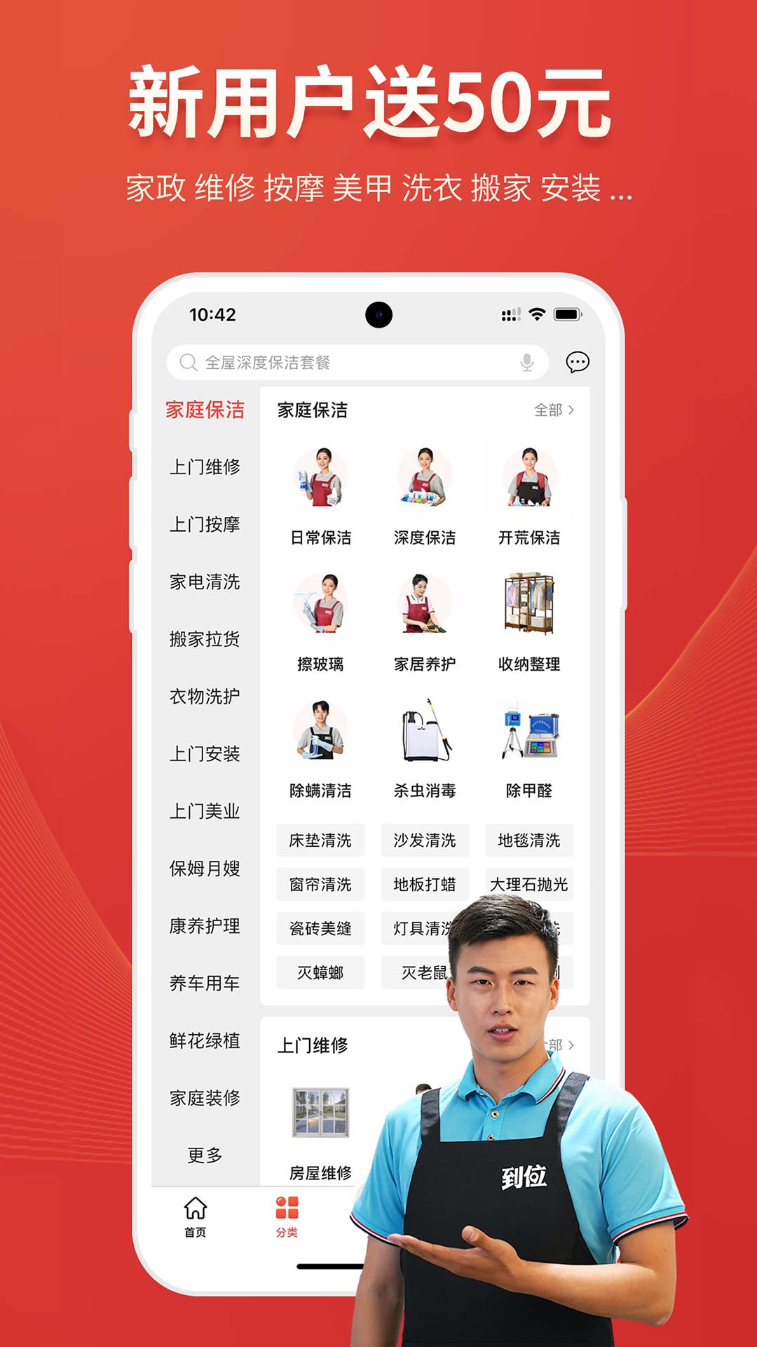 【到位10周年,感恩回馈】 上门按摩:下单赠100元SPA券哦~ 上门保洁:券后低至43元/小时; 洗衣洗鞋:免费上门取送,79元/3件; 上门美甲:99元起,不办卡随时约; 维修安装:24小时全天守候; 到位与您,相伴十载,未来更精彩~