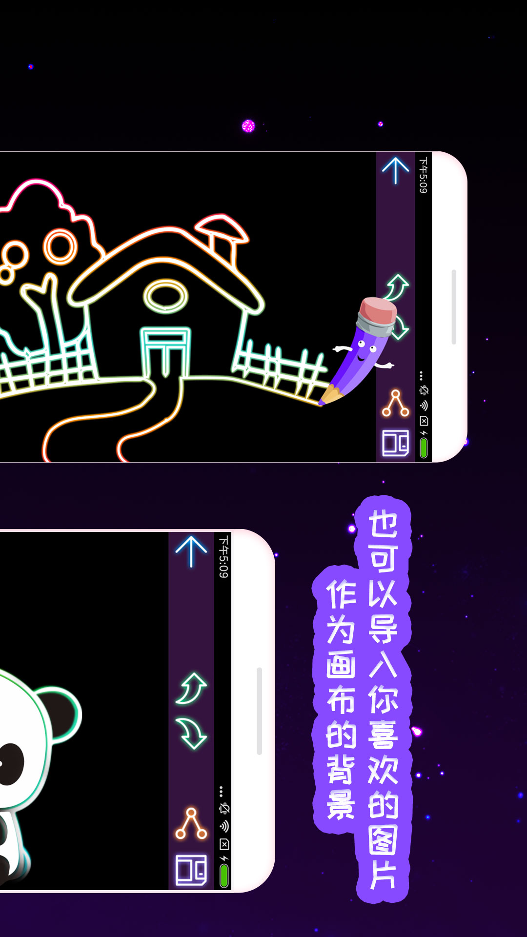 这个功能设计得十分人性化,而且非常特别哦。在这里,小朋友们不再只能选择单调的空白画布啦,还可以选择手机储存的图片,然后在这张图片上继续进行富有创造性的绘画,是不是很有趣呢?