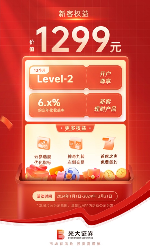 新客户在开立证券账户后,可免费领取如下权益: