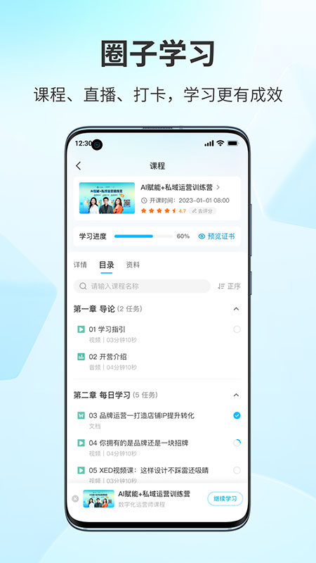 在学习成长板块,鹅圈子支持添加众多学习任务,像在线课程、直播、打卡活动等,从而为成员提供丰富多样的学习内容。