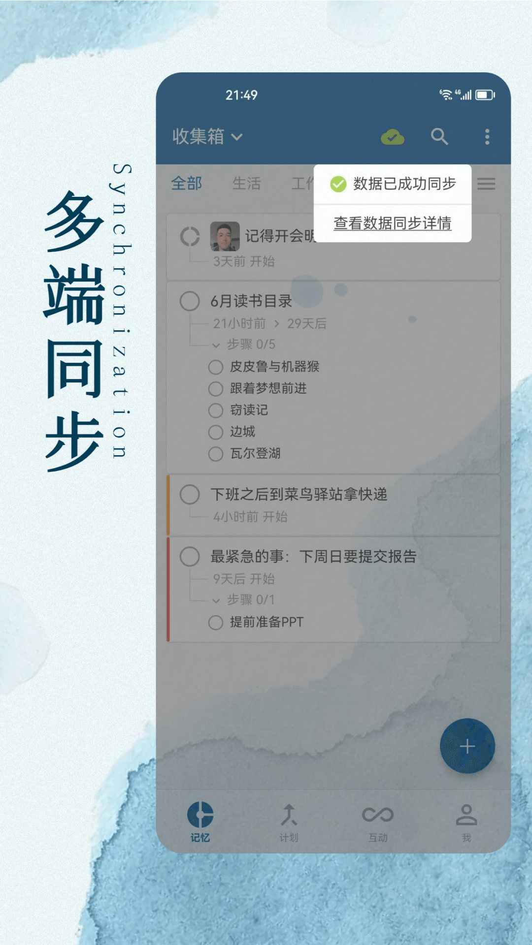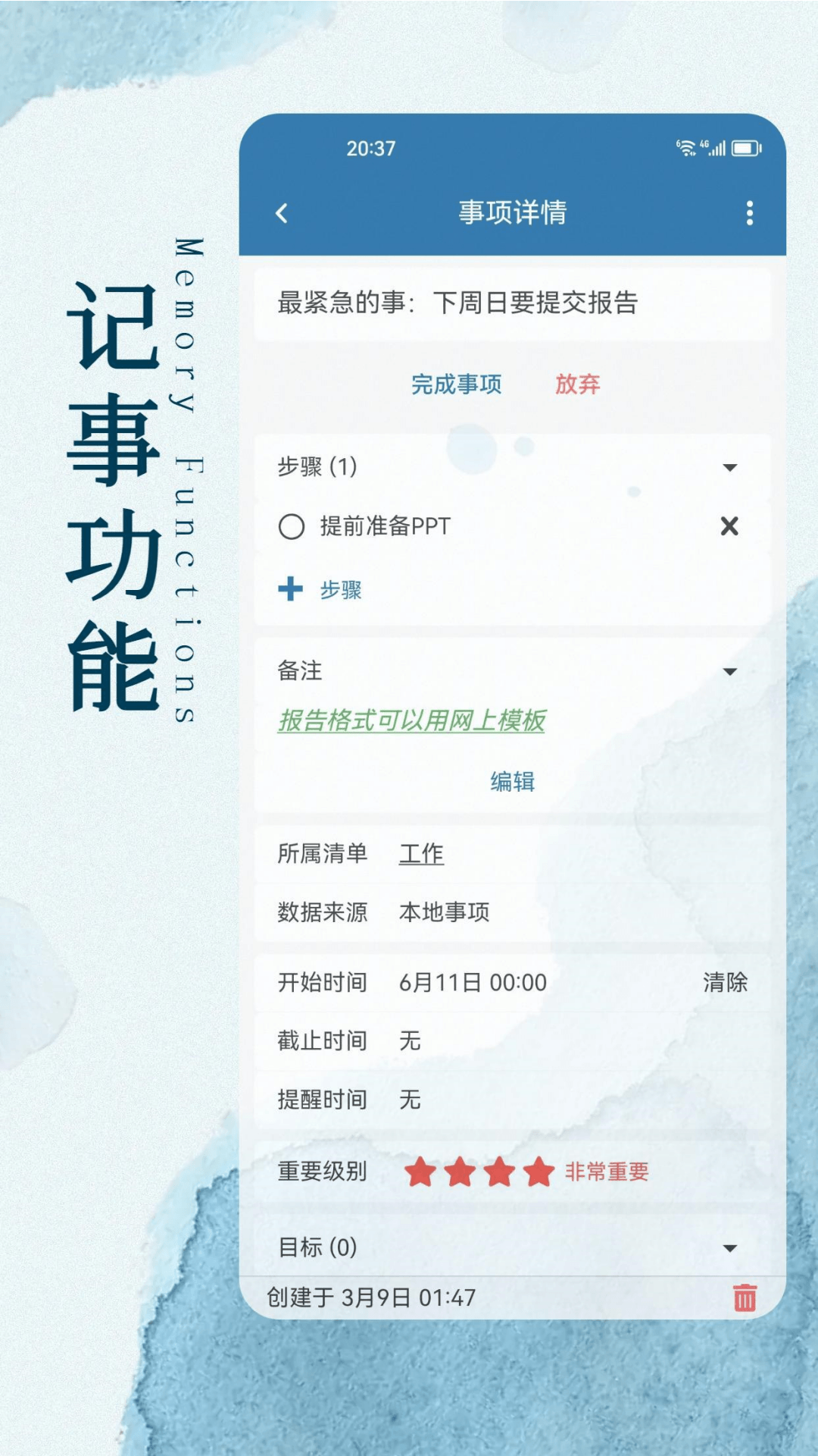它能汇集多渠道的事项类别,像本地创建的类似备忘录、待办性质的本地事项,依据自己的计划生成的计划事项,以及由好友创建的计划所产生的好友事项。具备多视图的事项展示方式,有列表、时间轴等展示形式。其事项归档功能颇具特色,那些已结束且无需再改动的事项在归档之后,数据同步效率会得到提升。还有丰富且可扩展的子功能系统,当前已经实现了起止时间、提醒、清单、重要级别、目标、步骤等功能。