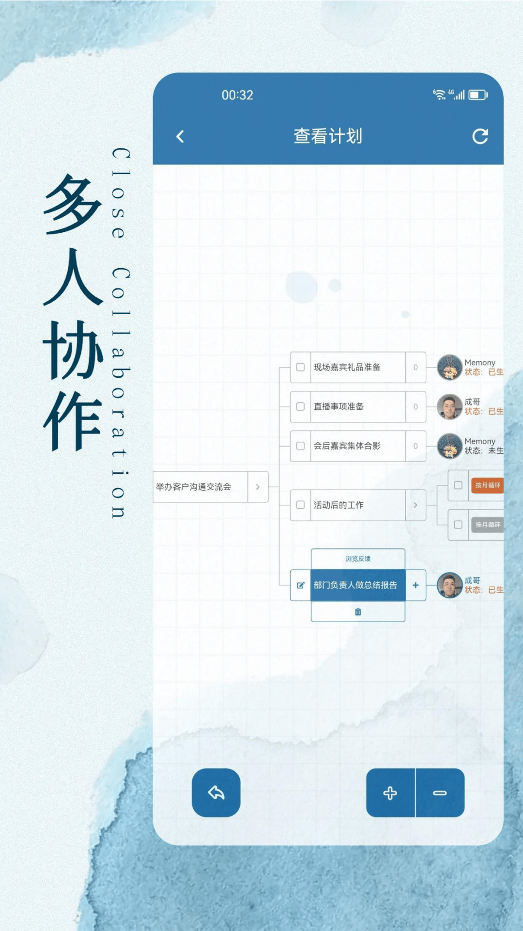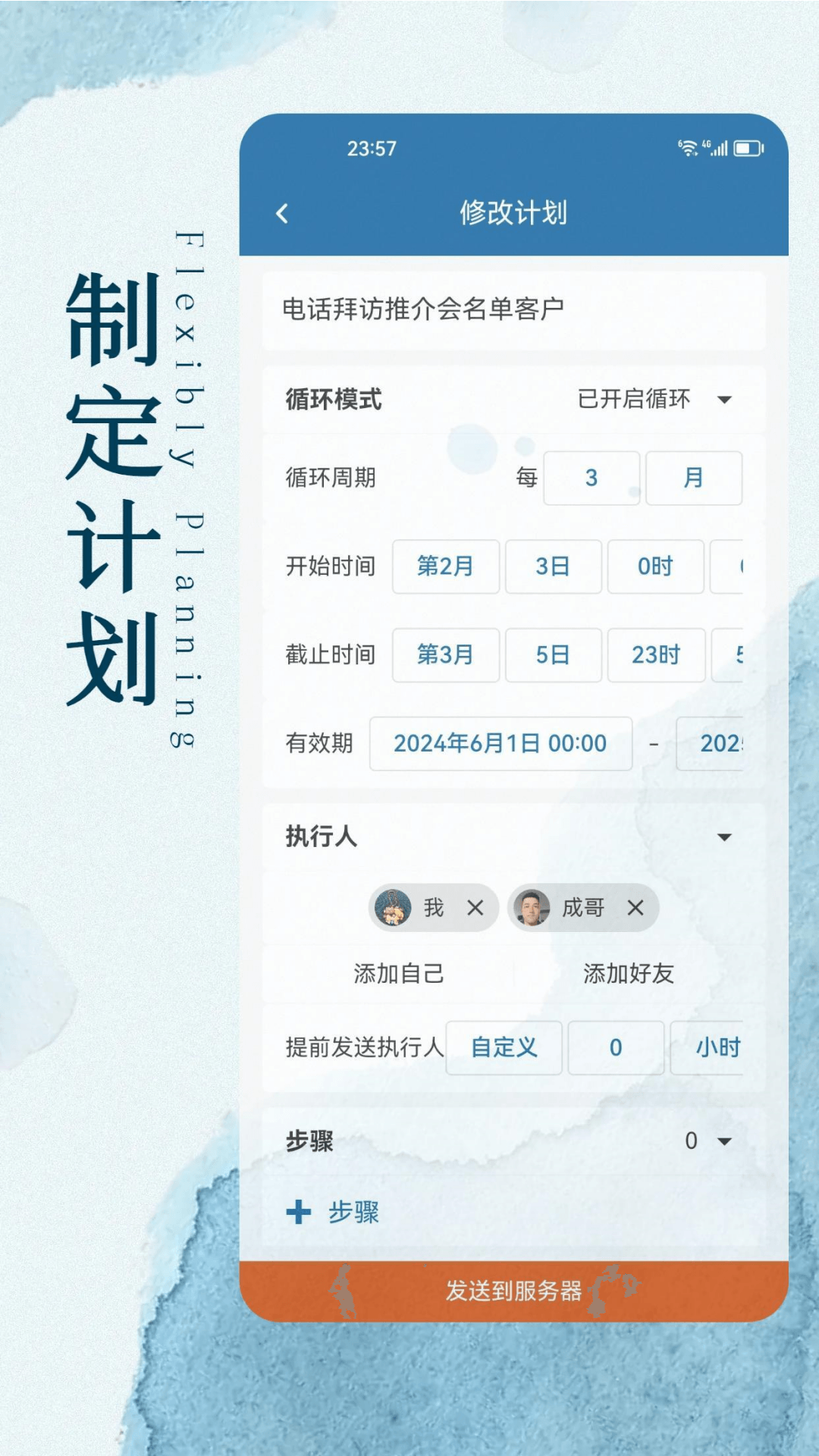 计划是基于特定目标而创建的,会按照指定的时间与规则生成事项,推送给特定的执行人,同时接收执行人的执行反馈。计划存储于服务器,以树状结构构建,在未指定执行人时能够无限层级创建子计划。可循环计划能够自动创建子计划,循环类型有年、月、周、日可供选择,可自定义重复周期,还能实现多级嵌套。
