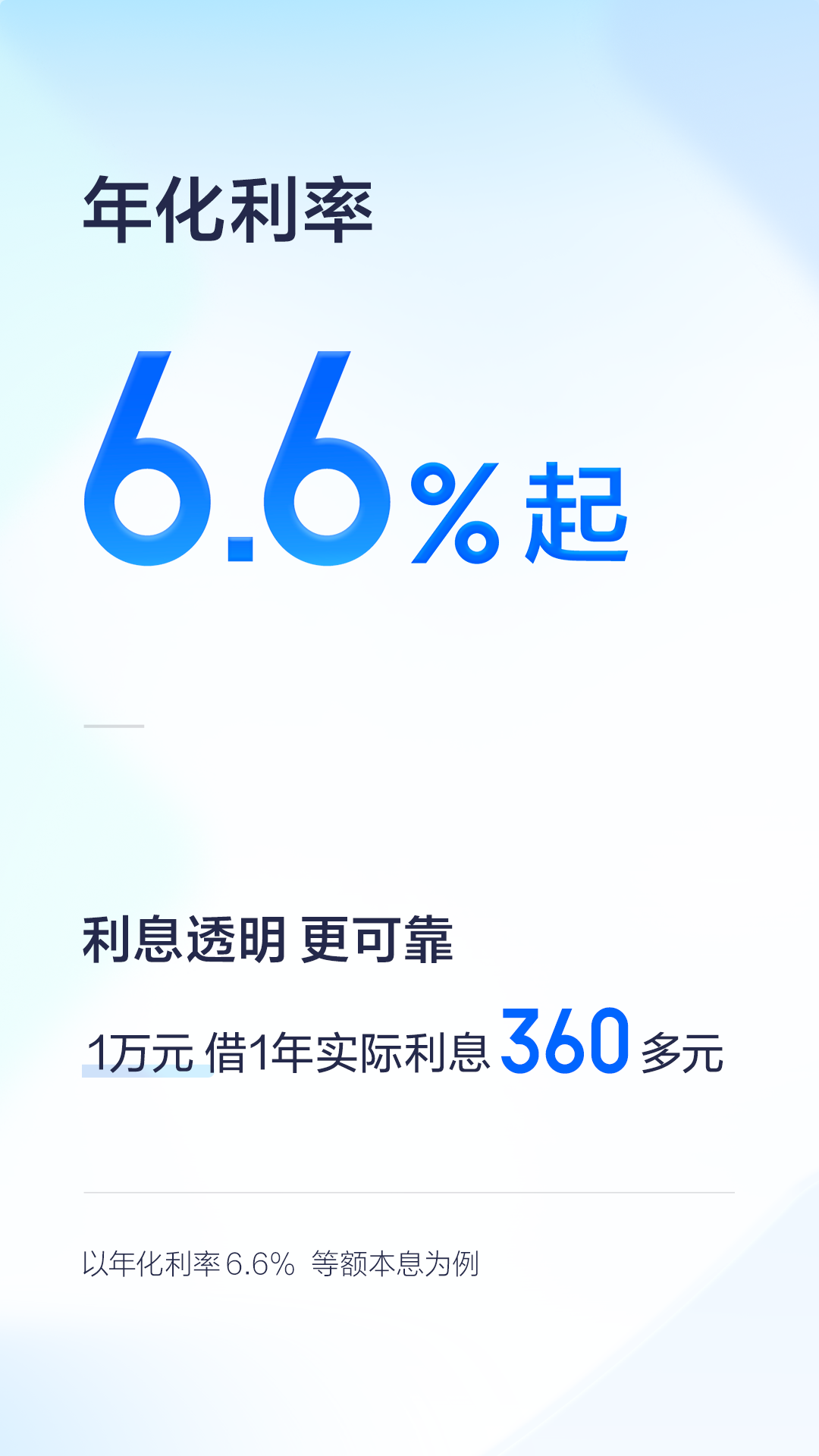 其二,息费清晰透明:利率从6.6%起,有着多种还款方式可供选择,最长可分24期还款。
