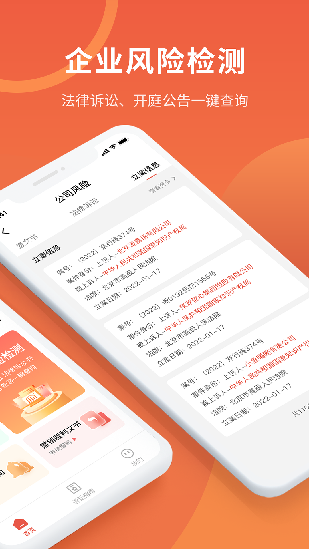 1. 一键详细查询,根据公司名称查找立案信息、法律诉讼、开庭公告等信息。