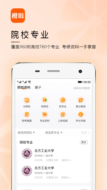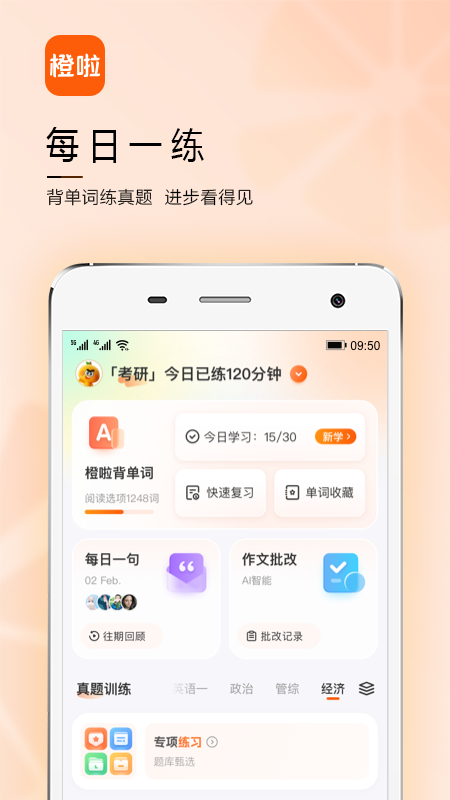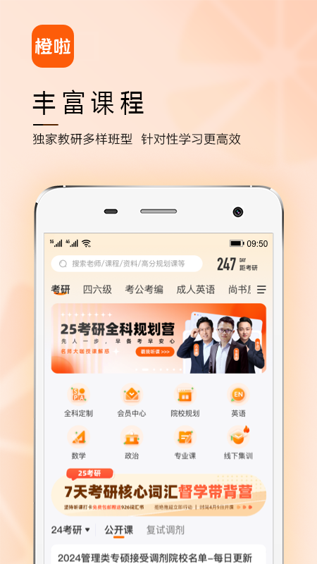 1. 涉及考研、英语四六级、实用英语、家庭教育、职业教育等多种学习类型,并且针对不同类型的课程给予学、练、测、答全方位的支持。学员在橙啦App中可以进行系统学习、强化练习、精准测试、及时答疑,形成完整的学习闭环。
