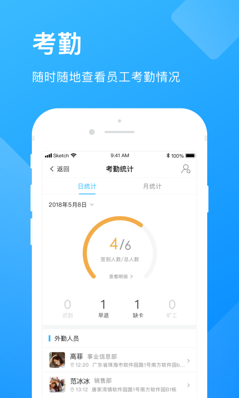 - 新增了快捷的签到方式,开放了员工考勤管理功能。能够移动实时在线统计签到状况,方便企业对员工出勤情况的管理。