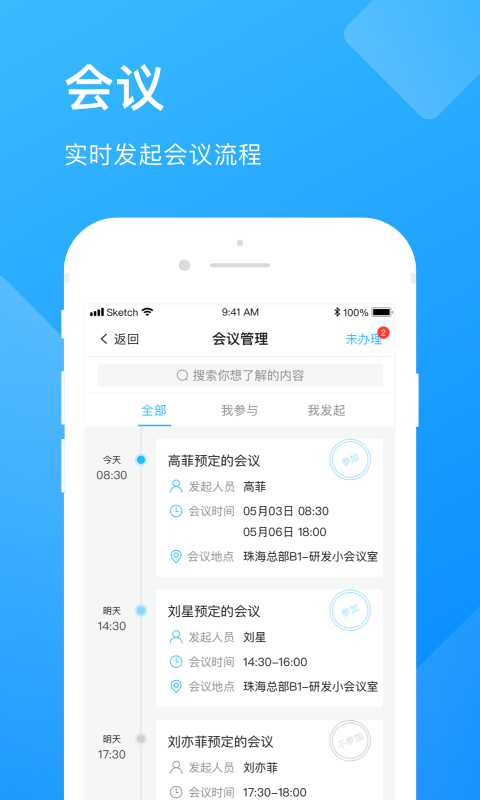- 全新的会议功能模块集成了对标准会议室和临时会议室的创建、修改、删除等功能。参会人员通过扫描二维码的方式入场,更便于统计参会人员情况。