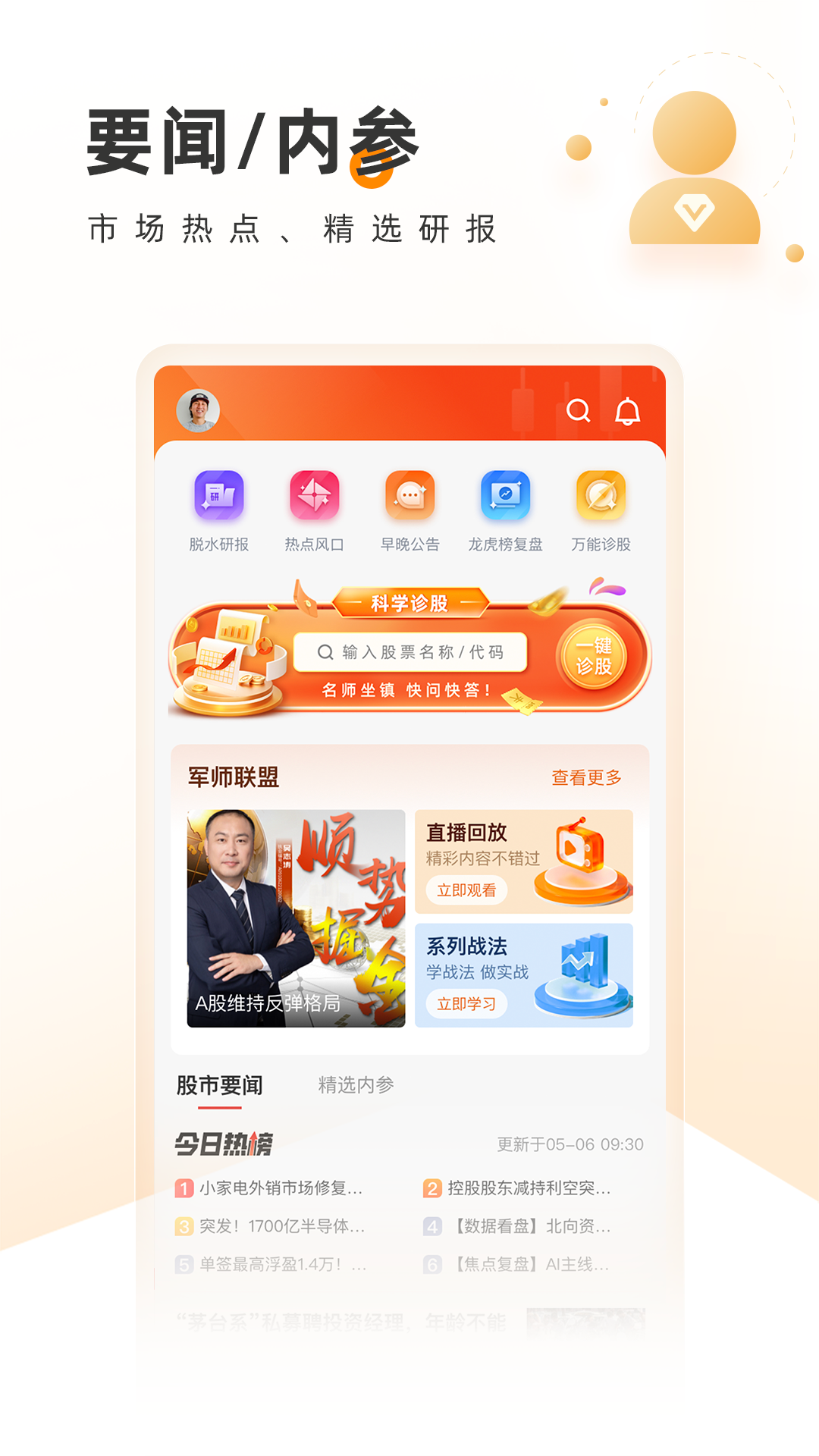 - 极速诊股:借助大数据,从技术面、资金面、消息面、行业面和基本面这几个维度对个股进行综合评判,针对每一只股票给出短线、中线、长线的操作建议。