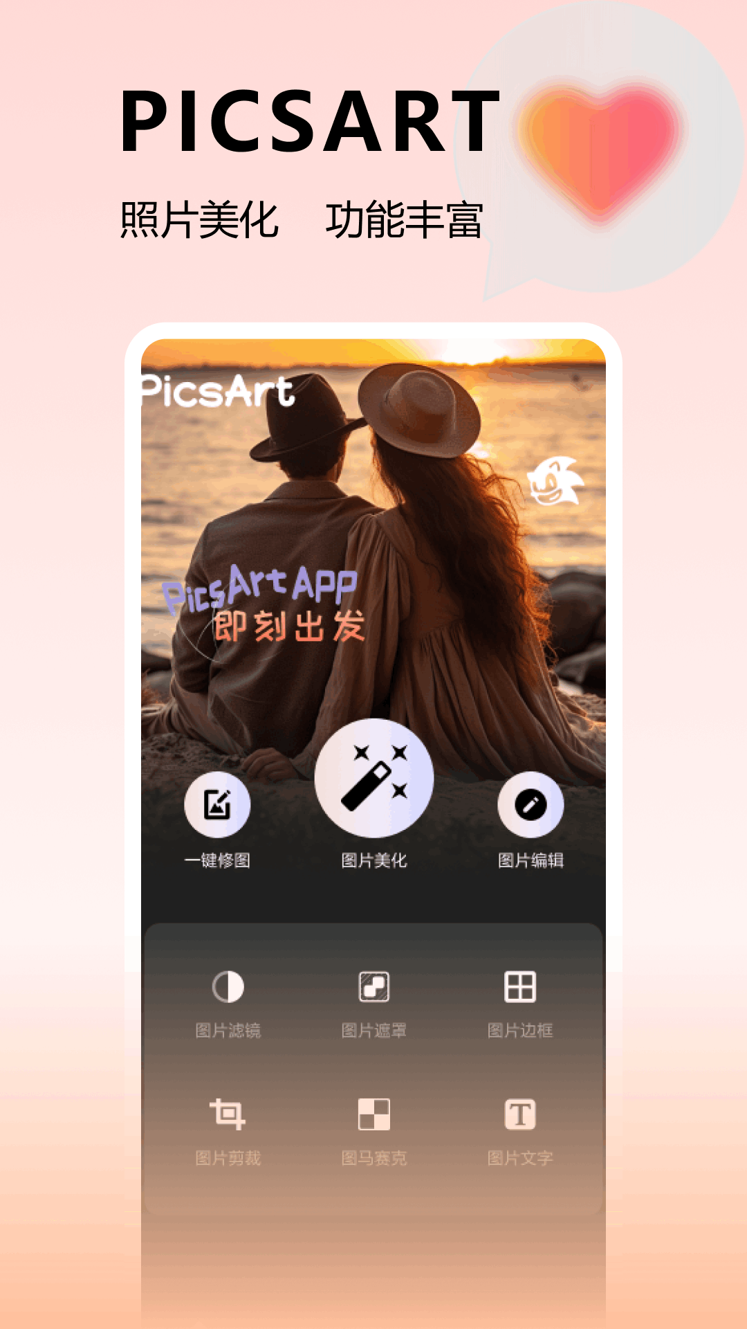 PicsArt美易是一款图片编辑类的应用软件。在这款软件中,有着诸多实用的功能,例如提供各种各样的图片滤镜,能让图片呈现出不同的色彩和风格效果;具有边框功能,可以为图片添加各种特色边框;能够进行裁剪操作,方便用户根据需求调整图片尺寸;设有马赛克功能,满足用户对部分图片内容进行模糊处理的需求;还支持在图片上添加文字,让图片表达更丰富的信息。此外,软件还有精选的精美壁纸,非常值得大家前来下载体验。