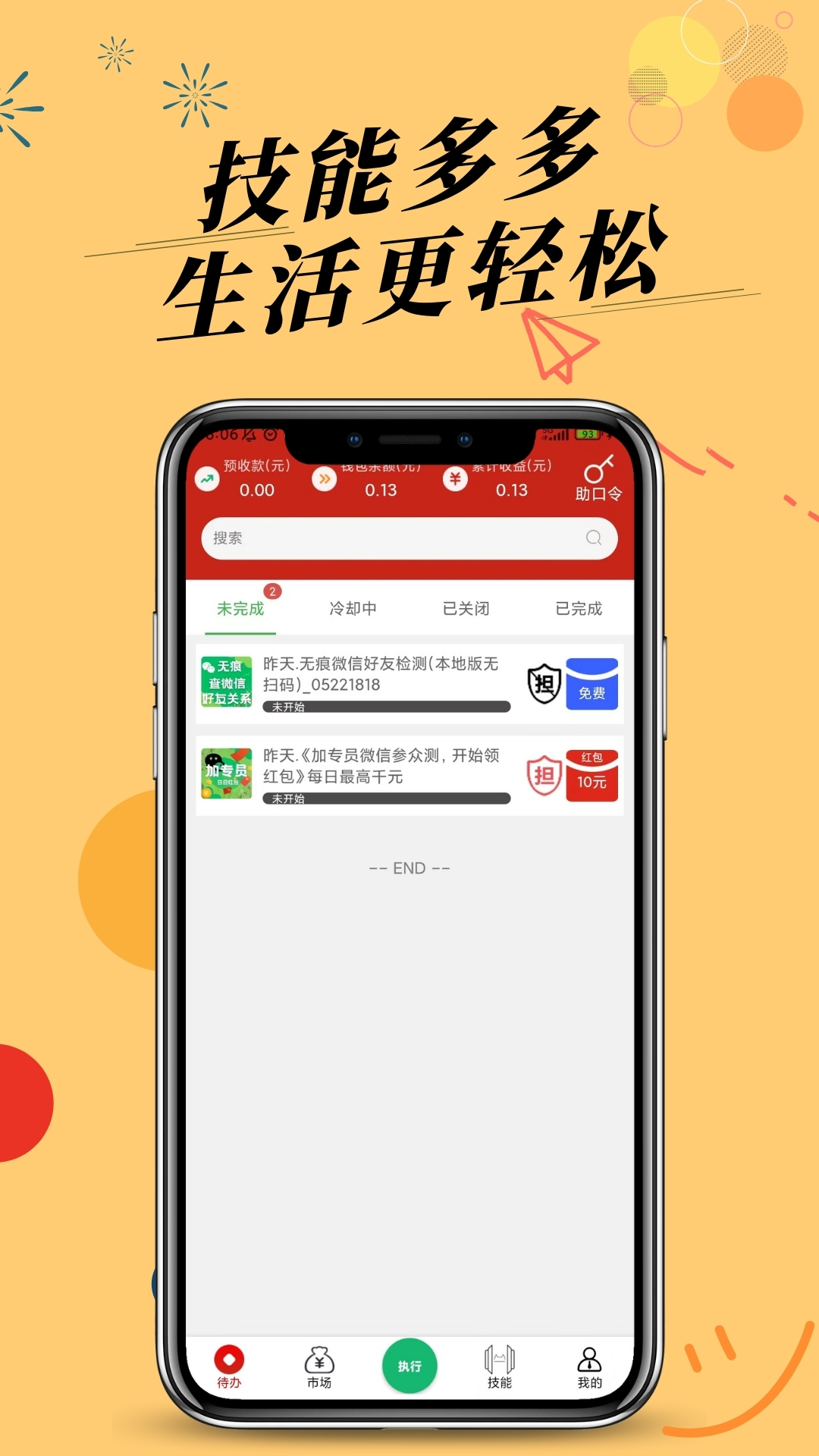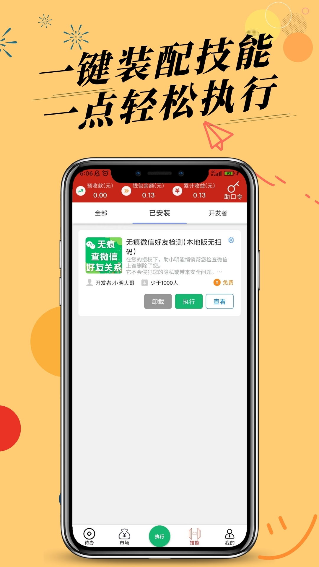 其具备一个丰富多样的技能市场,像查看微信里删除您的人、挂号抢票、群发或自动回复微信消息、经营网店、给朋友圈点赞,甚至还能代您打工赚钱等都不在话下。只要是您能在手机上做的事情,助小明都可以为您完成。