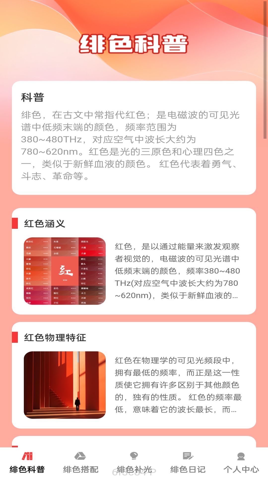 绯色乐看是一款专注于色彩的全能应用,为您提供全面的颜色科普、精准的颜色搭配建议、智能拍照补光和个性化的日记记录功能,让您的生活充满绚丽色彩和无限创意。【绯色科普】探索颜色的奥秘,提供丰富的色彩科普知识,让您掌握每一种色彩的独特魅力。【绯色搭配】查询各种颜色的RGB值,获得科学的色彩搭配建议,为您的创意增色添彩。【绯色补光】拍照补光功能,智能调整光线,让每一张照片都散发出绯色般的光彩。【绯色日记】记录生活的点滴,以色彩、文字和图片形式,打造独一无二的个性化日记。