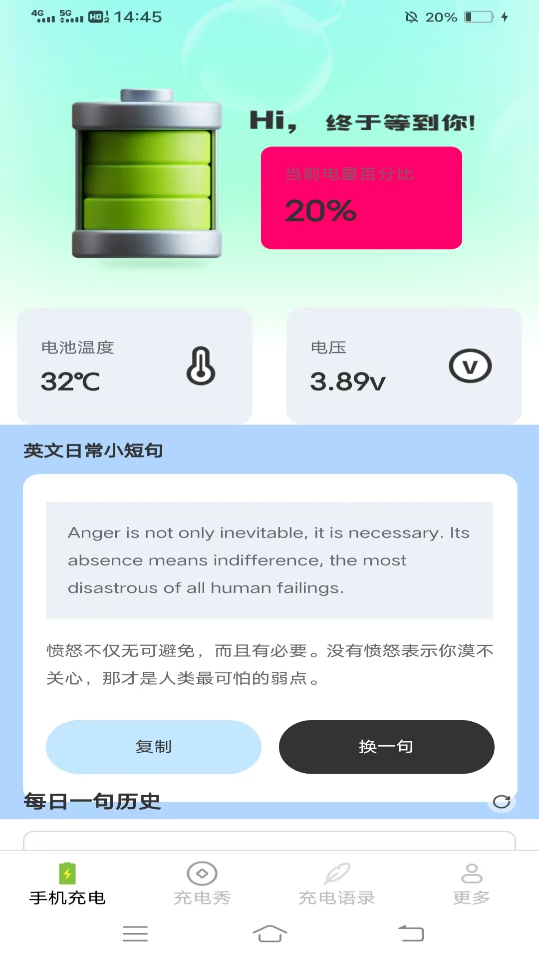 【手机充电】查看手机当前电量和电池温度电压等。