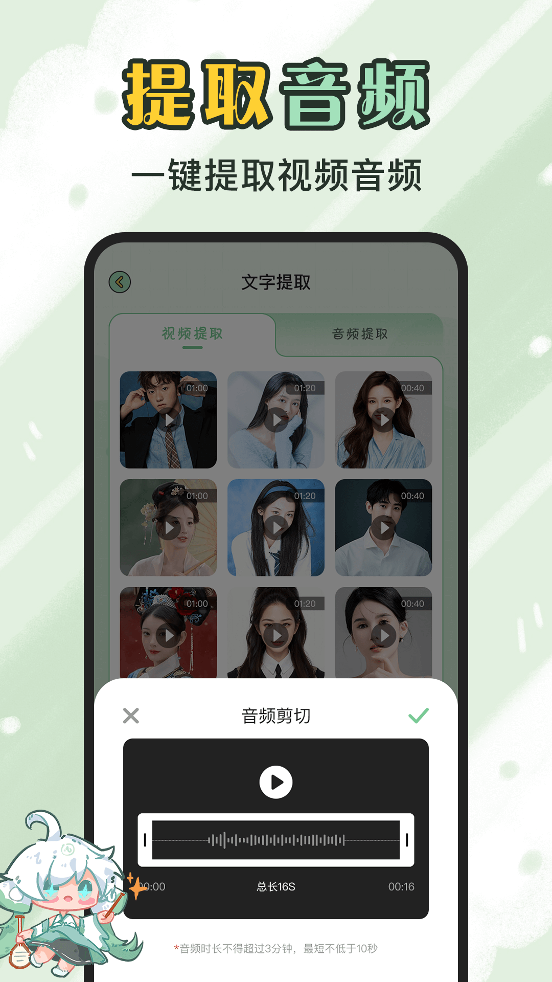 3.文字提取功能,可将视频中的语音提取出来,转换成文字,供您创作。