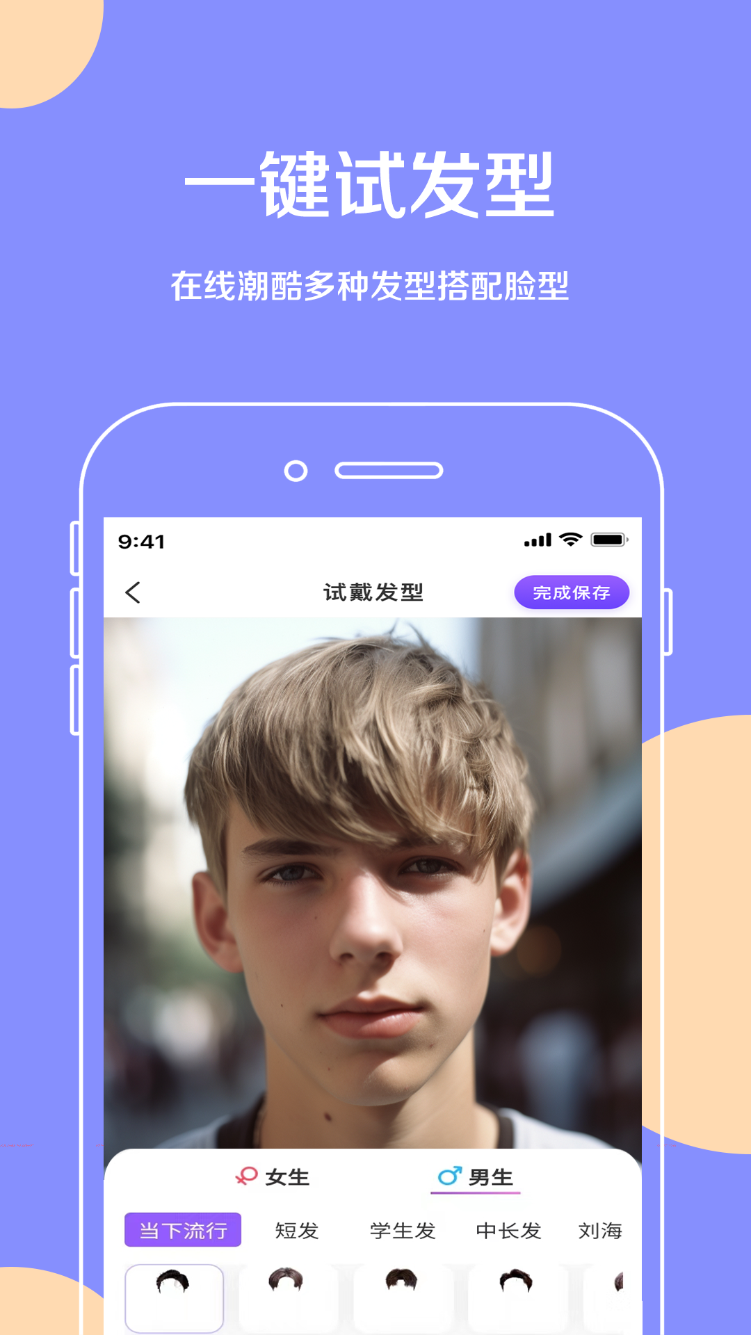 采用智能人脸识别技术,无论是拍照还是选择照片(只需一张正脸照),就能尝试多种类型的发型,像男士发型、女士发型、学生发型、女生发型、短发造型、刘海发型、新娘发型等。如果想要更换发型或者测试某种发型是否适合自己,只需按下拍照按钮,系统就会自动匹配发型,操作极其简便。
