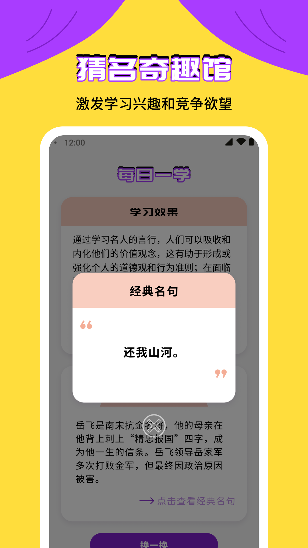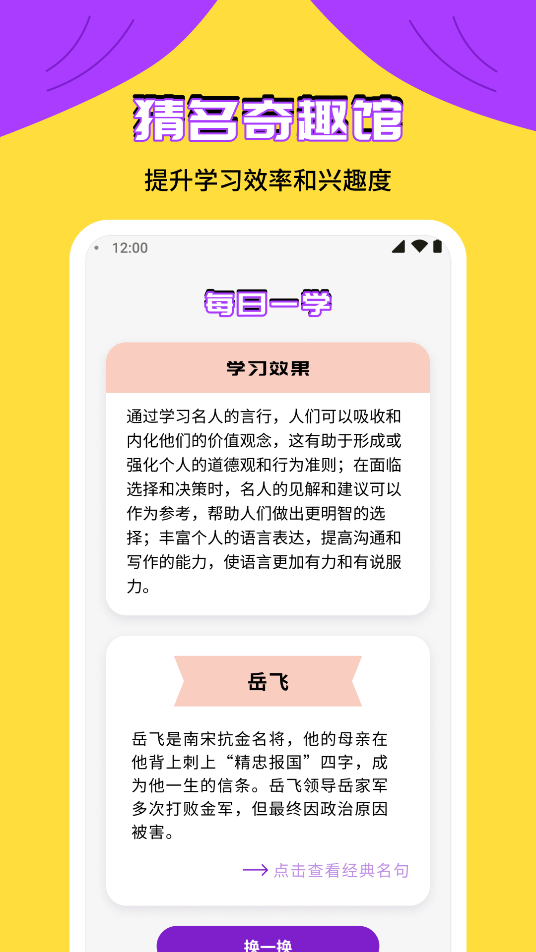 探索名人智慧,挑战认知极限!“猜名奇趣馆”让你通往知识海洋的钥匙。通过与名人问答的精彩互动,带你深入了解世界各领域的杰出人物,从历史巨匠到当代先锋,无所不包。而每日一学则是你的科普知识宝库,让你在轻松愉悦的氛围中不断充实自己。提供了经典名人名句,让用户随时随地感受他们的智慧启示。赶快下载,踏上名人智慧之旅吧!