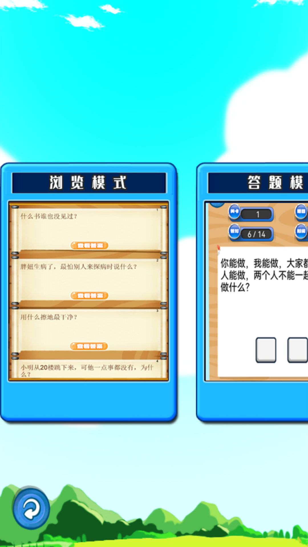 开心脑筋急转弯包含了数千条脑筋急转弯题目,锻炼您从不同角度思考问题,帮助您打破固有思维,培养灵活多变的思维能力。软件包含了多款模块: