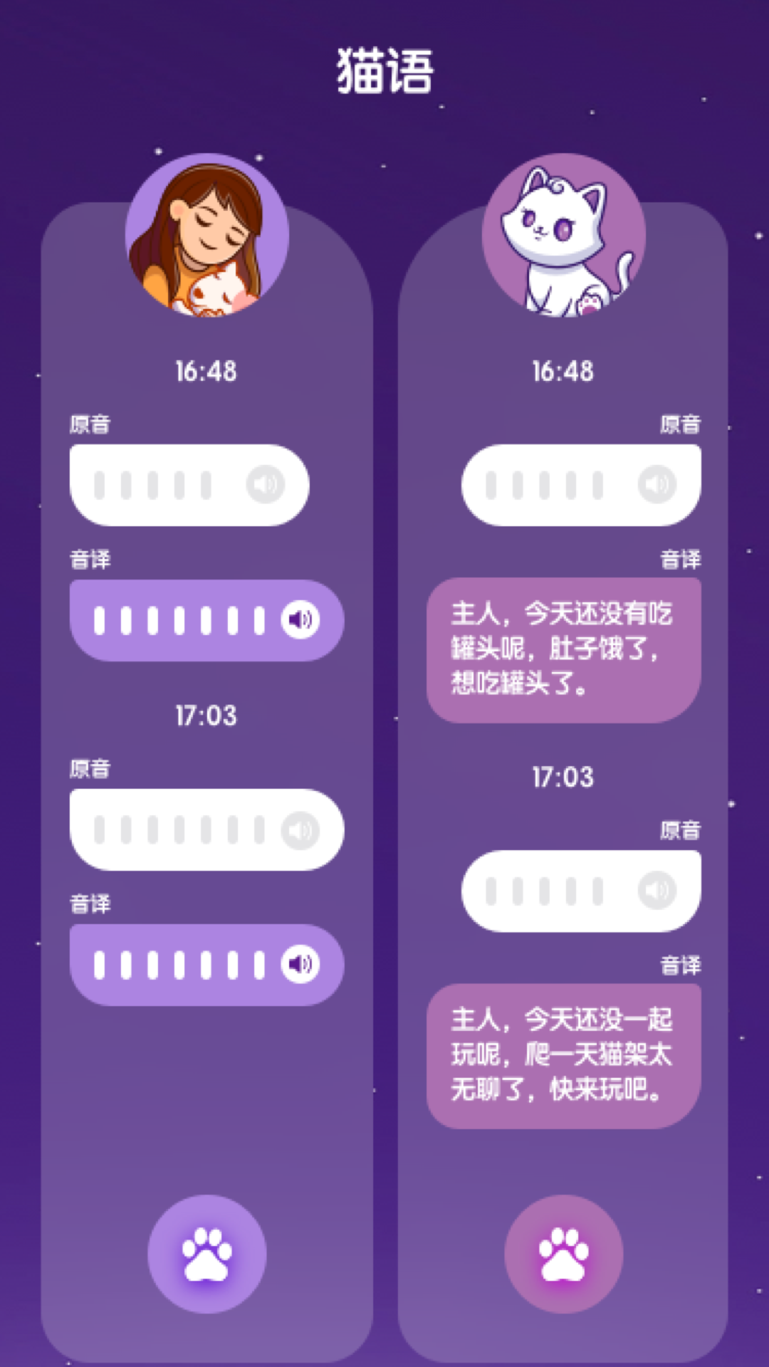 这里有极具特色的呼噜页面,在这个页面上,你能够随心所欲地对猫呼噜声的快慢进行调节,从而去感受在不同节奏下所带来的舒适惬意与全身心的放松。而且还具备猫叫声调节功能哦,从温柔亲昵的轻声呼唤,到娇嗔可爱的喵喵声,都能让你的心灵得到深深的抚慰。